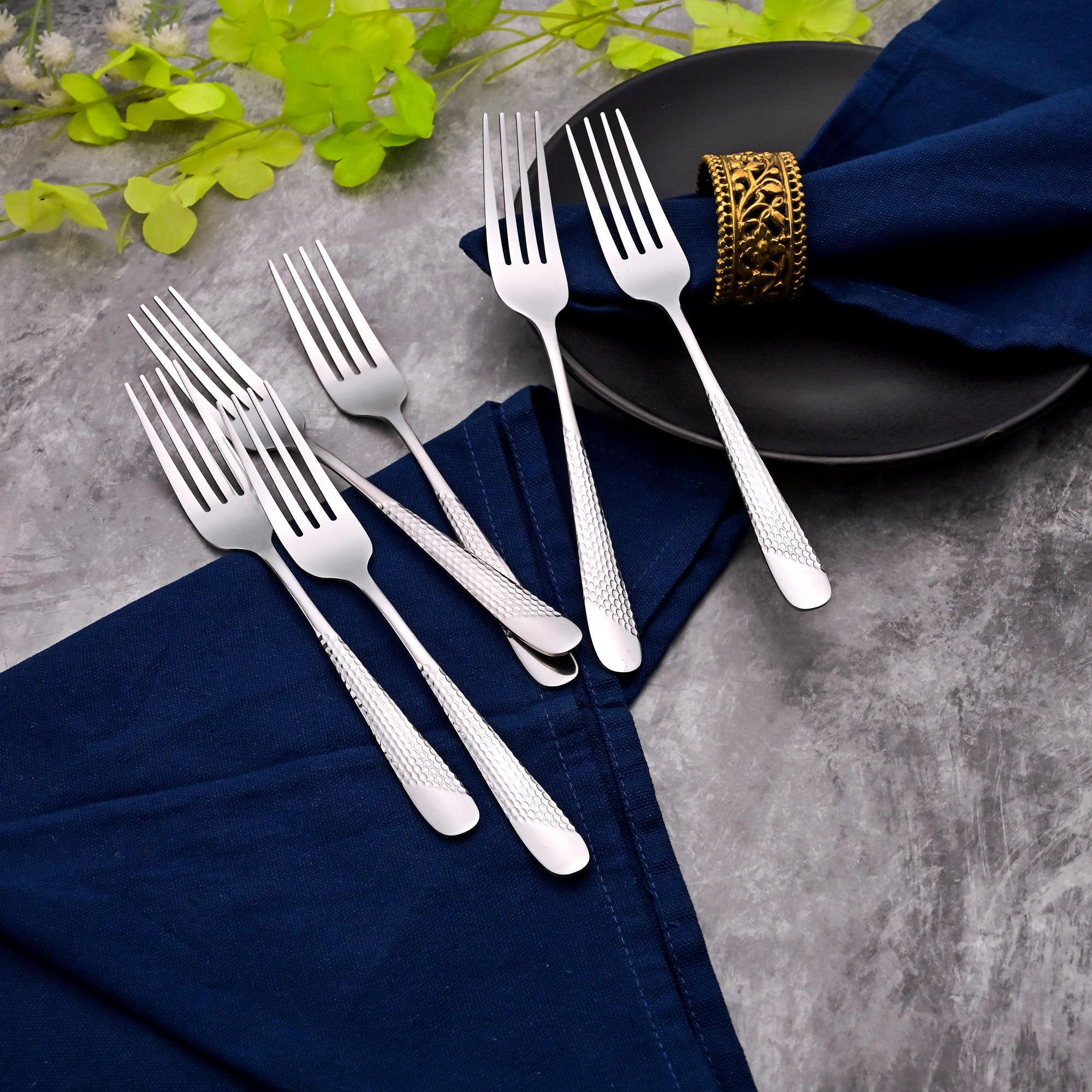 COD availableEnjoy your desserts, fruits, and bite-sized treats with this elegant MiniGlow Silver Dessert Fork Set. Made from premium stainless steel, these small forks feature a hammered design on the handles for a versatile and refined look. Perfect for special occasions or everyday sweet moments.