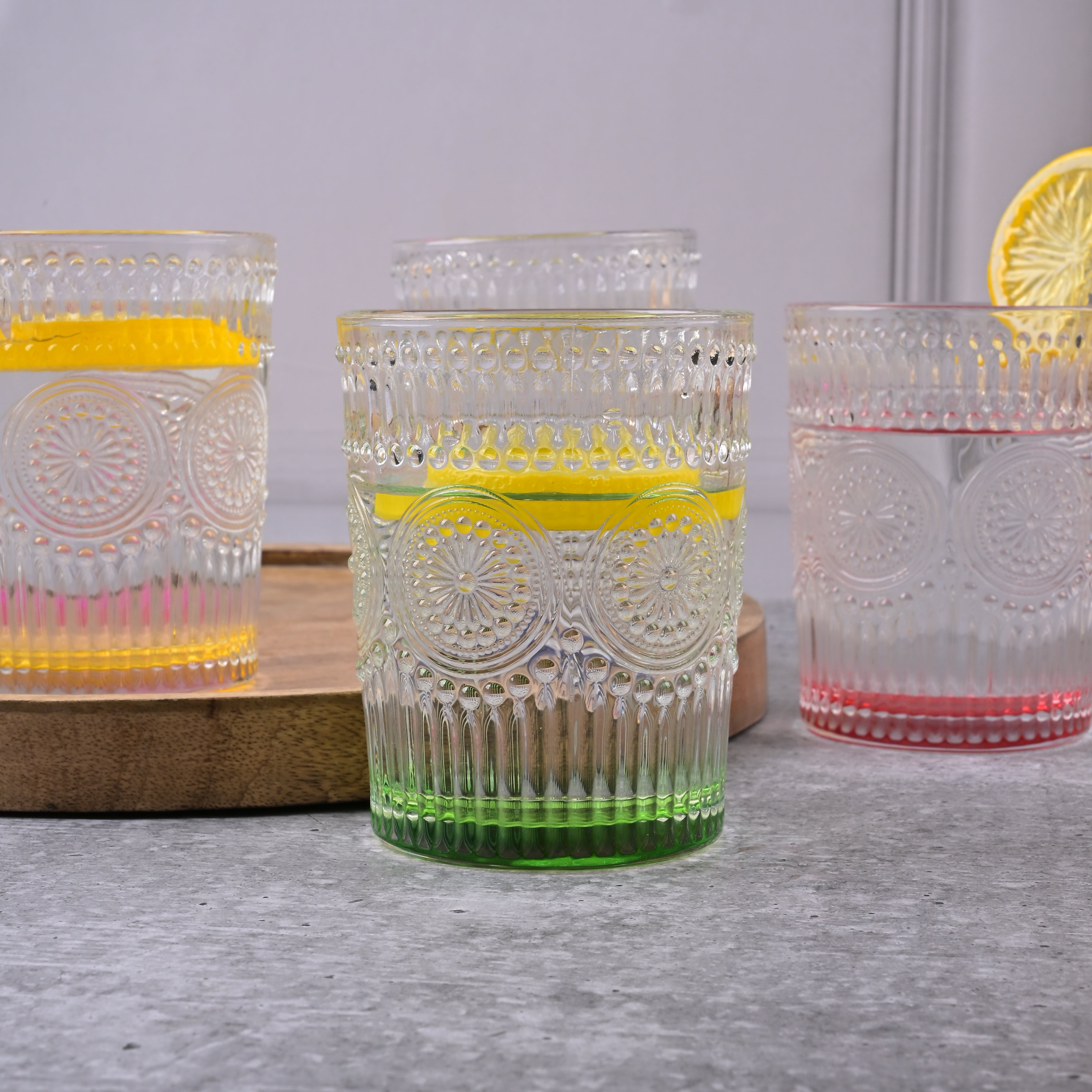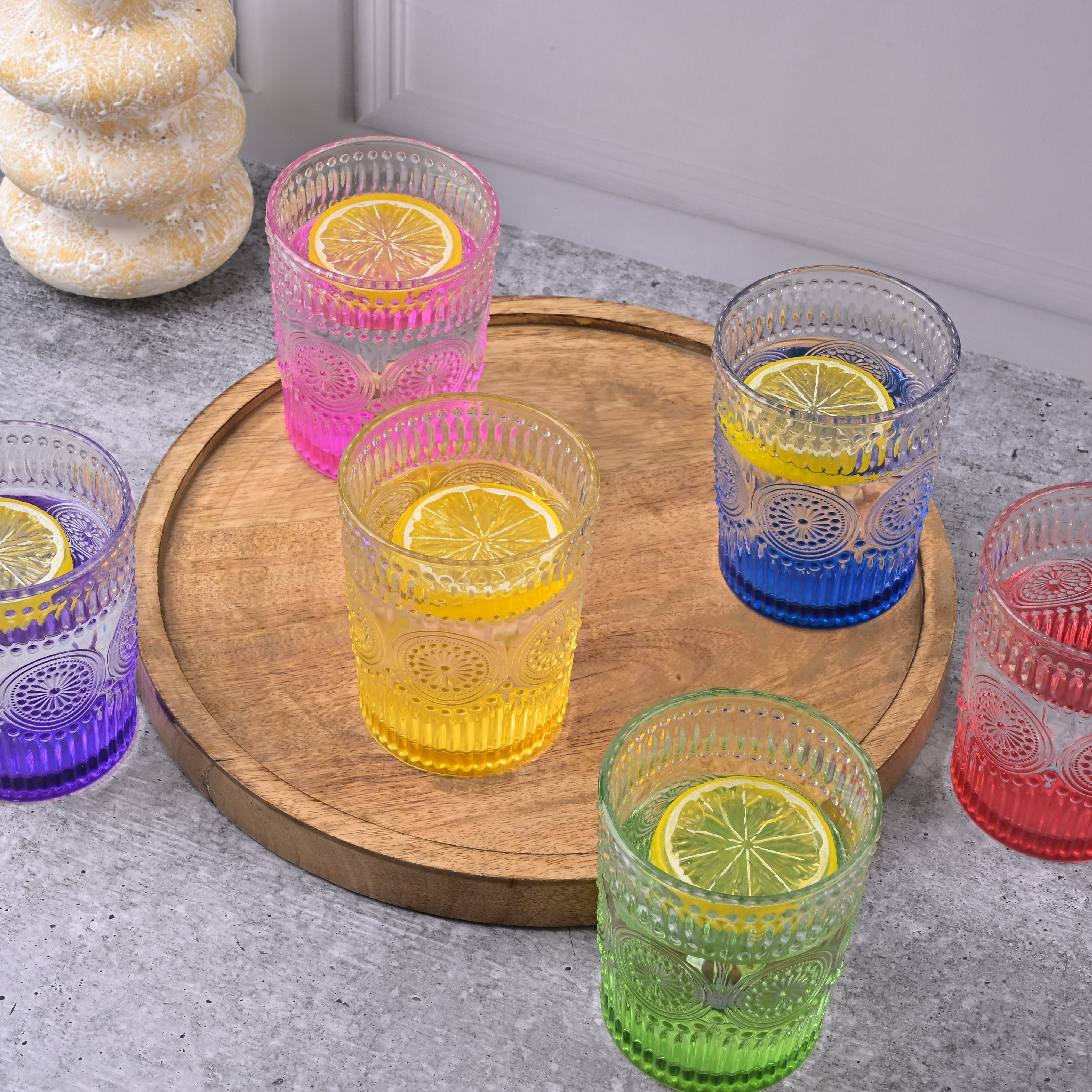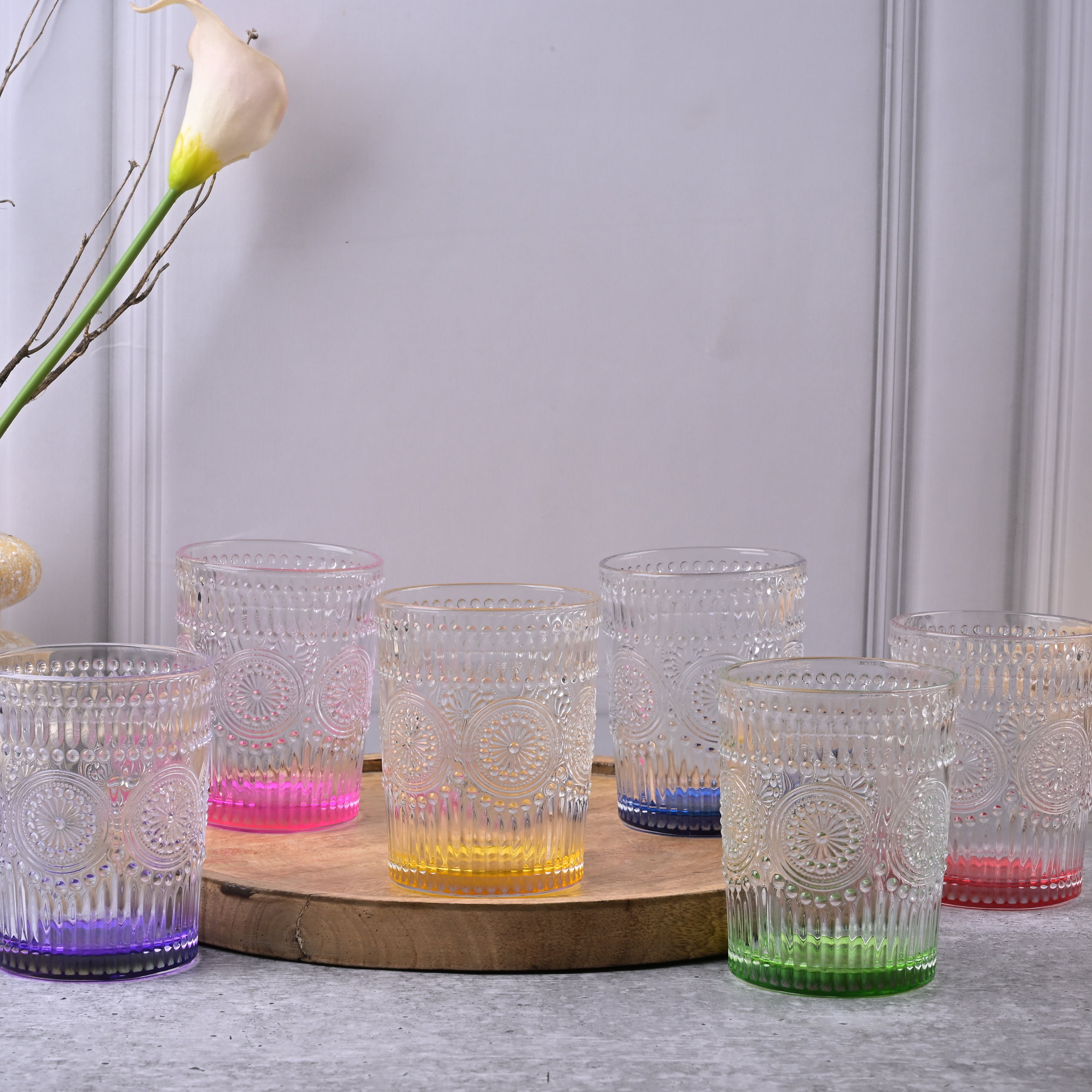 COD availableAdd a splash of fun to your dining experience with this 'Multicolor Textured Drinking Glasses.' Each glass features a sturdy, clear bowl with a base tinted in multiple colours so that every sip feels like a celebration. These drinking glasses are perfect for serving juices, mocktails, or refreshing beverages. Their simple, colourful design will add a playful touch to your table.