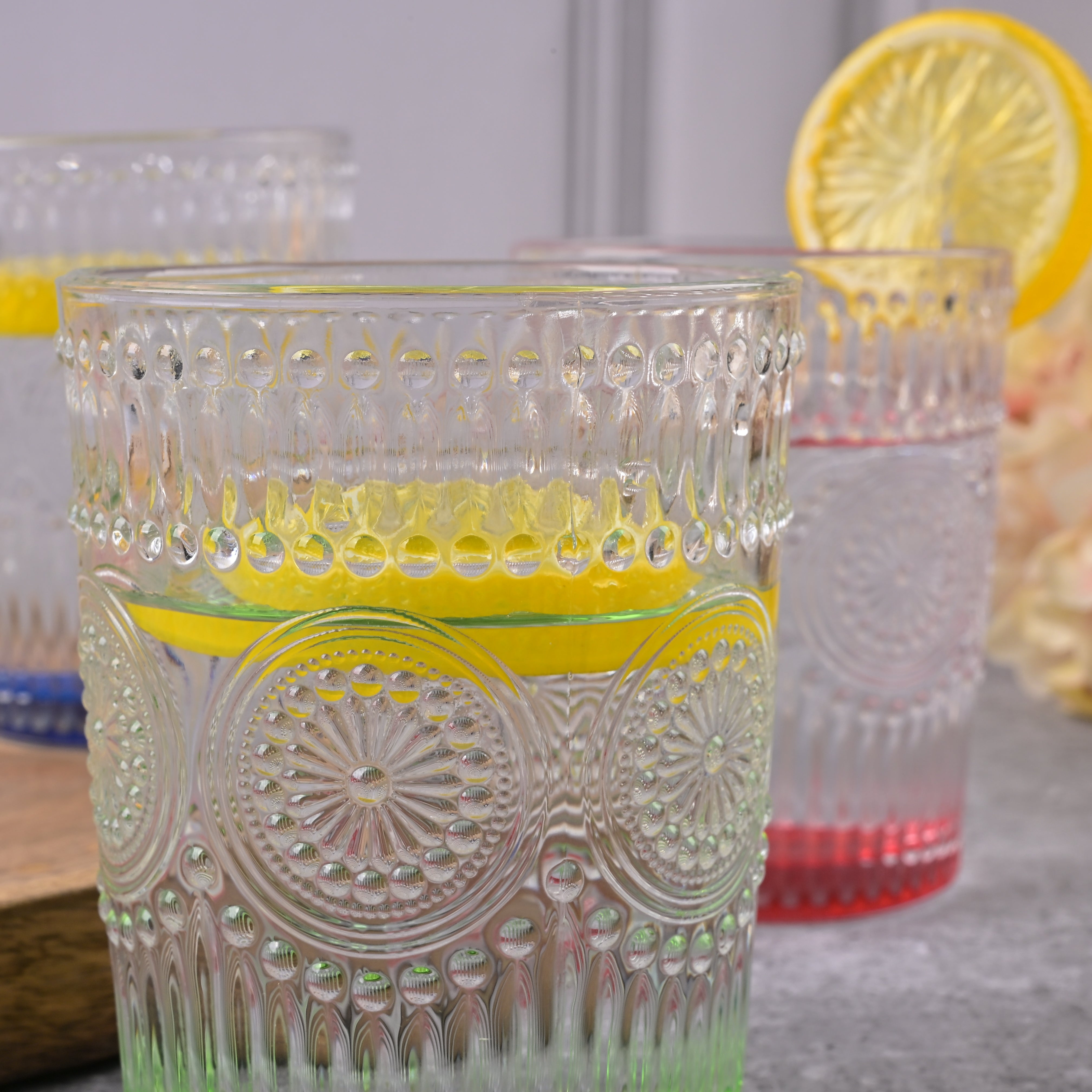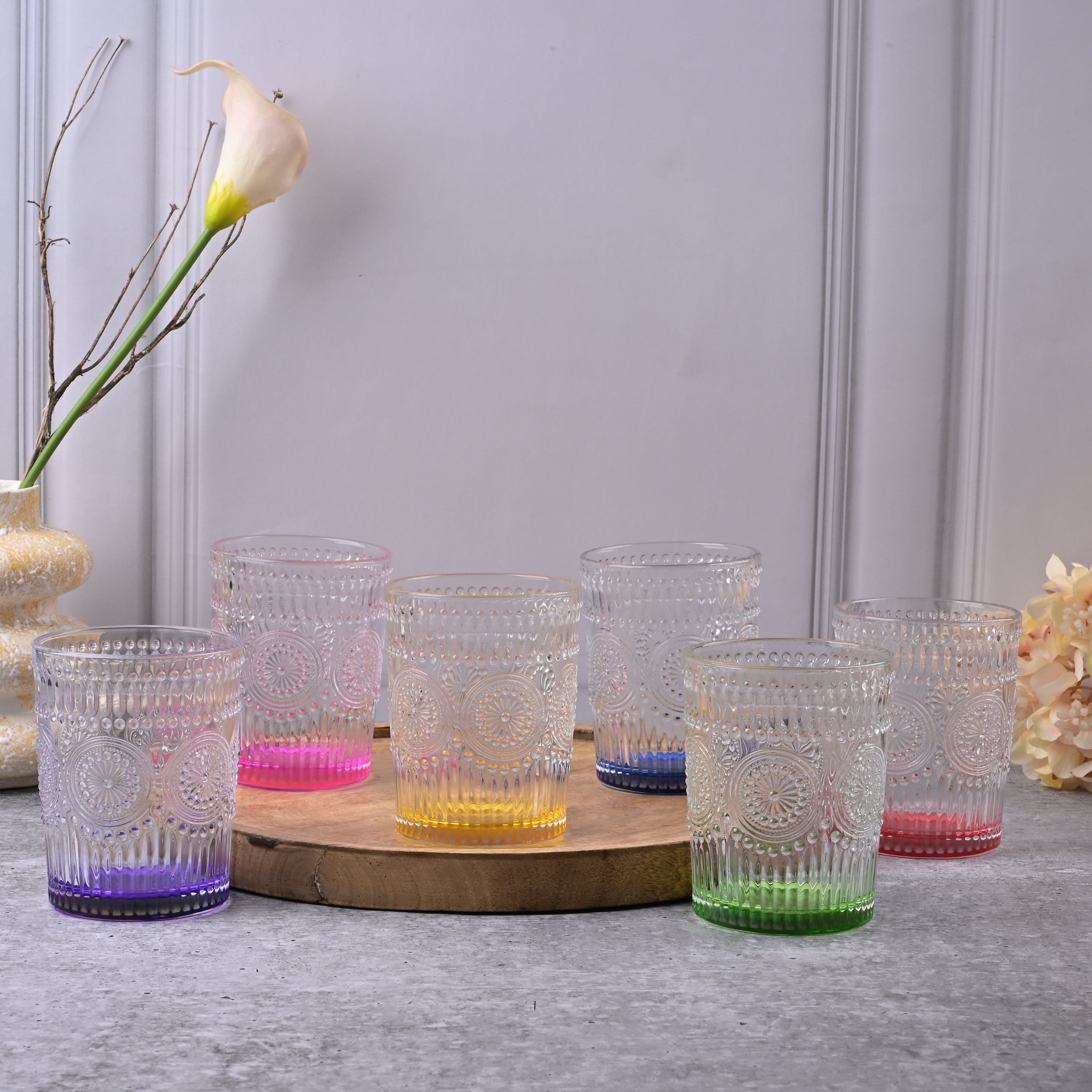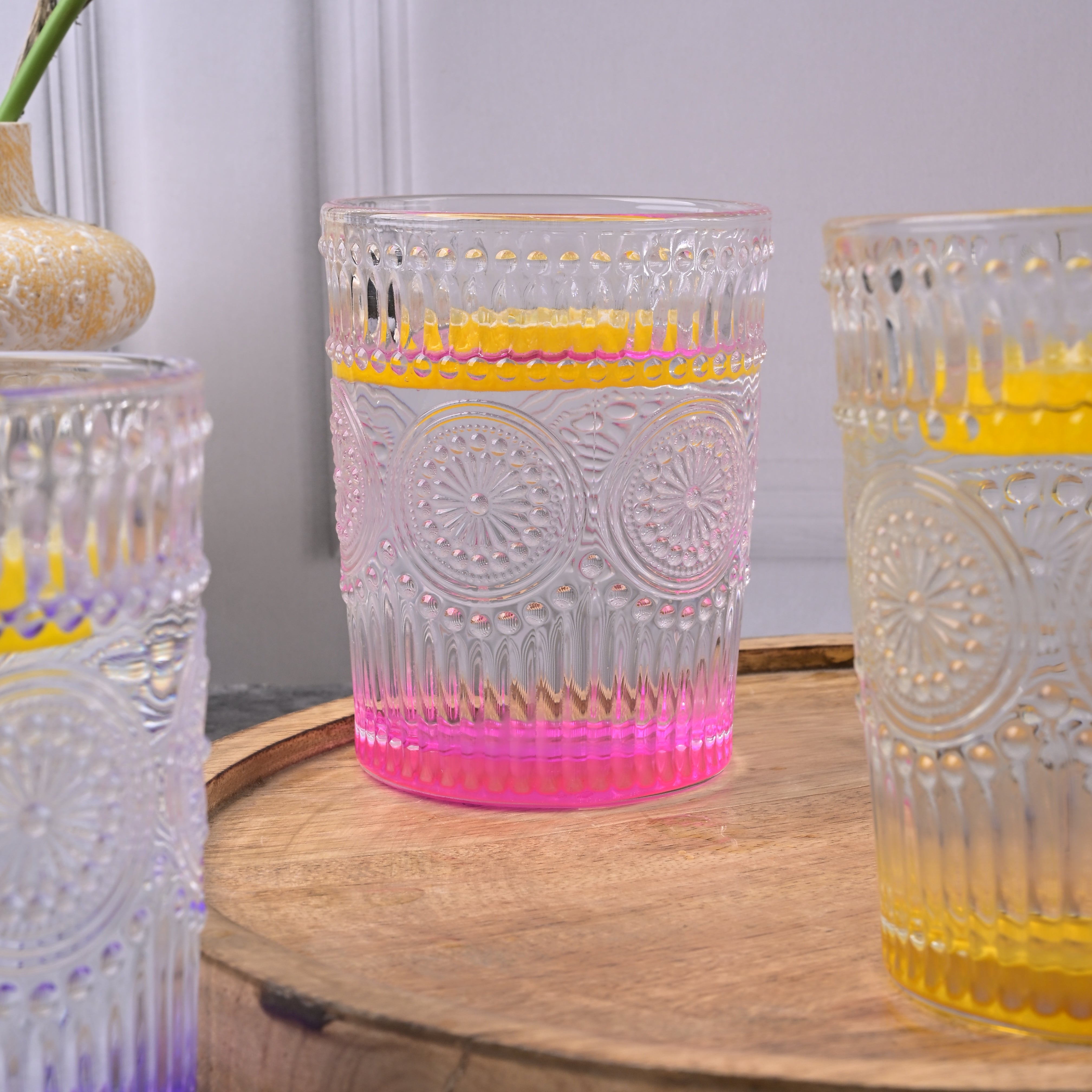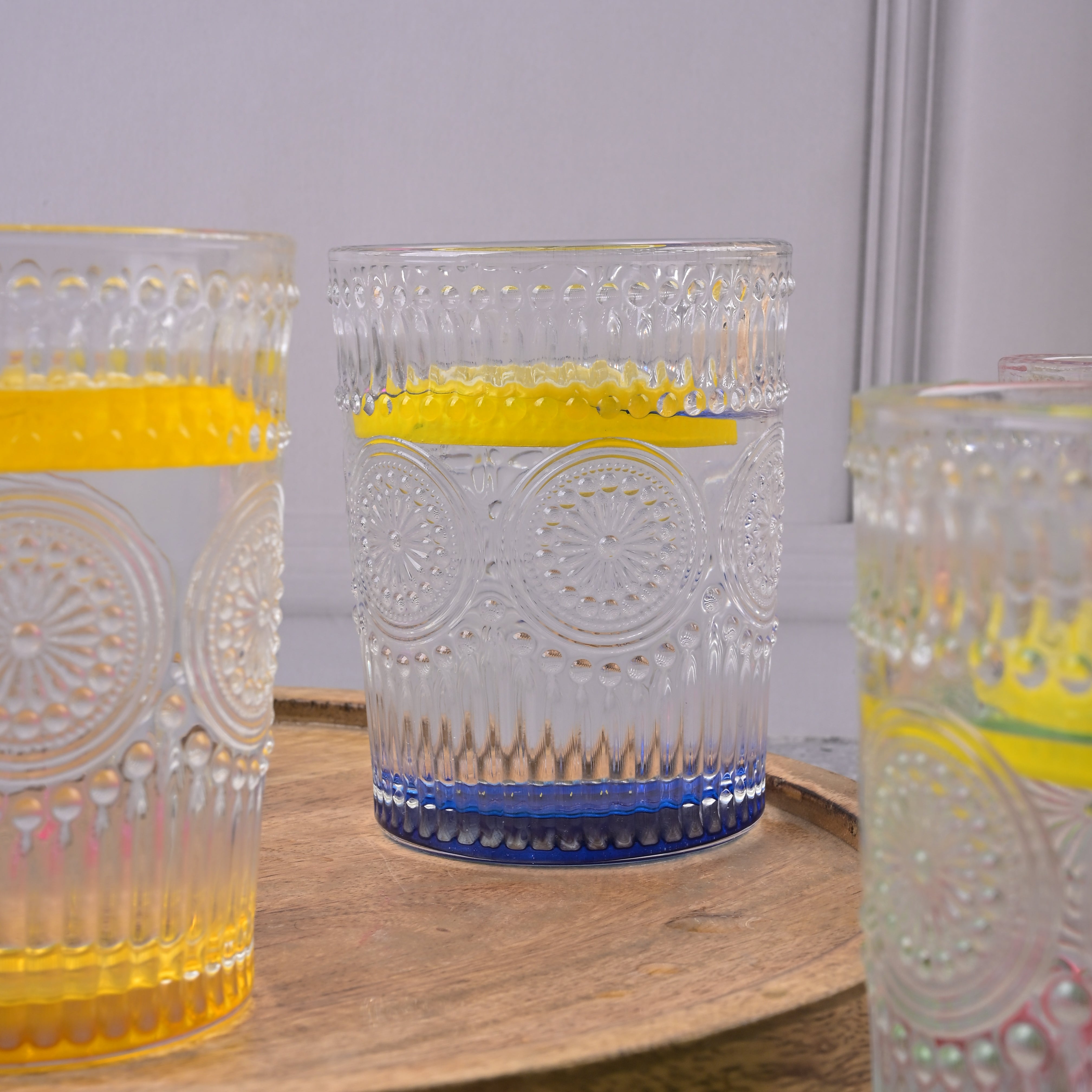 COD availableAdd a splash of fun to your dining experience with this 'Multicolor Textured Drinking Glasses.' Each glass features a sturdy, clear bowl with a base tinted in multiple colours so that every sip feels like a celebration. These drinking glasses are perfect for serving juices, mocktails, or refreshing beverages. Their simple, colourful design will add a playful touch to your table.