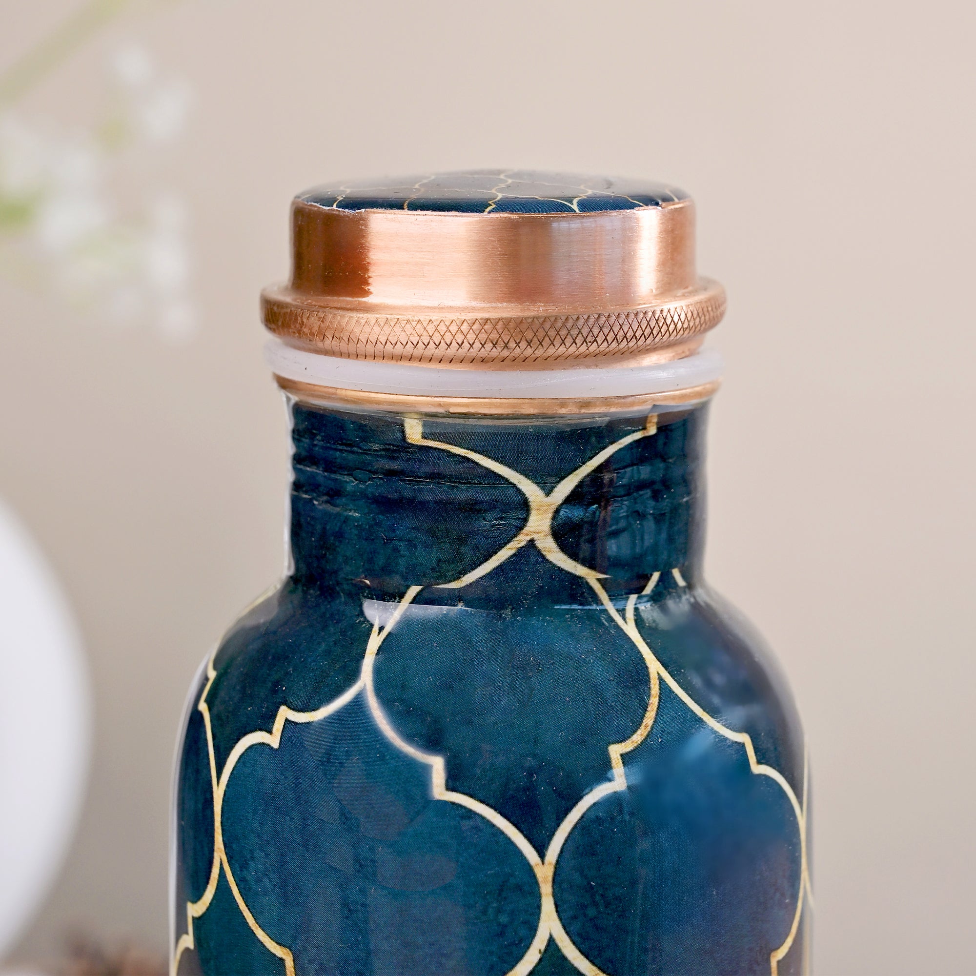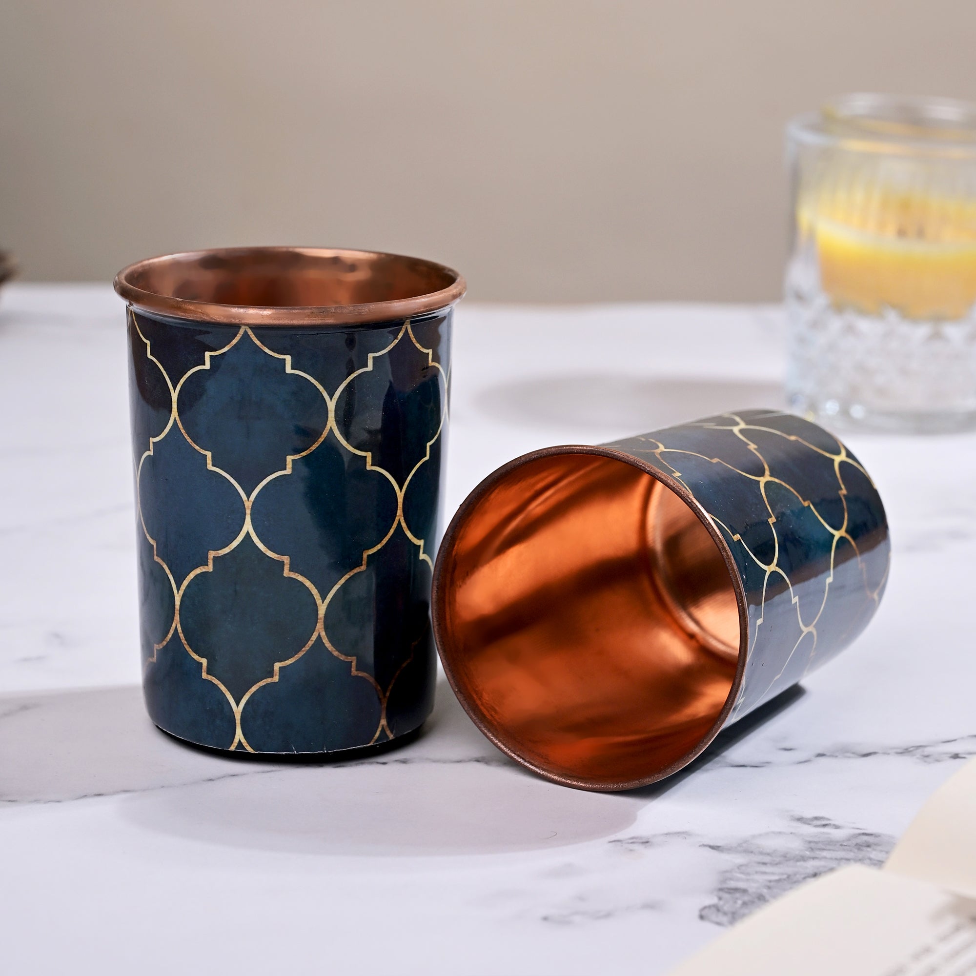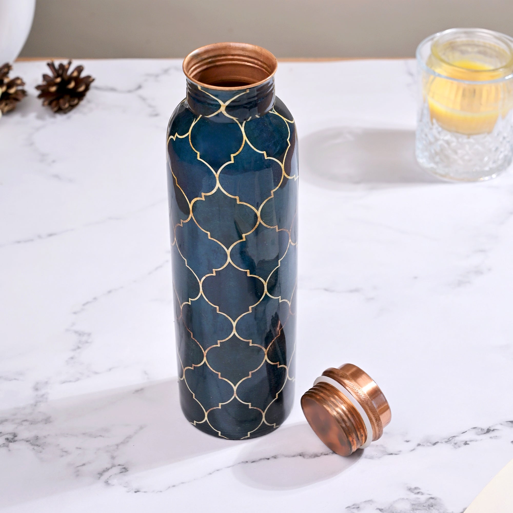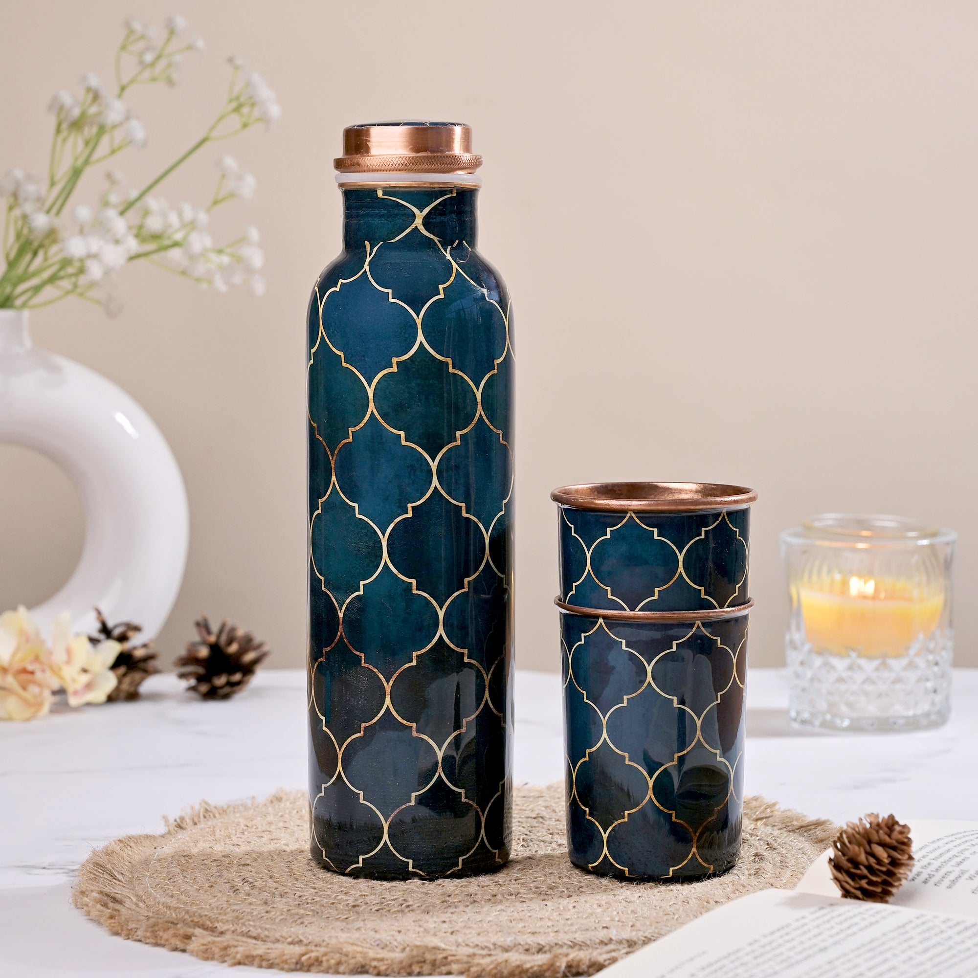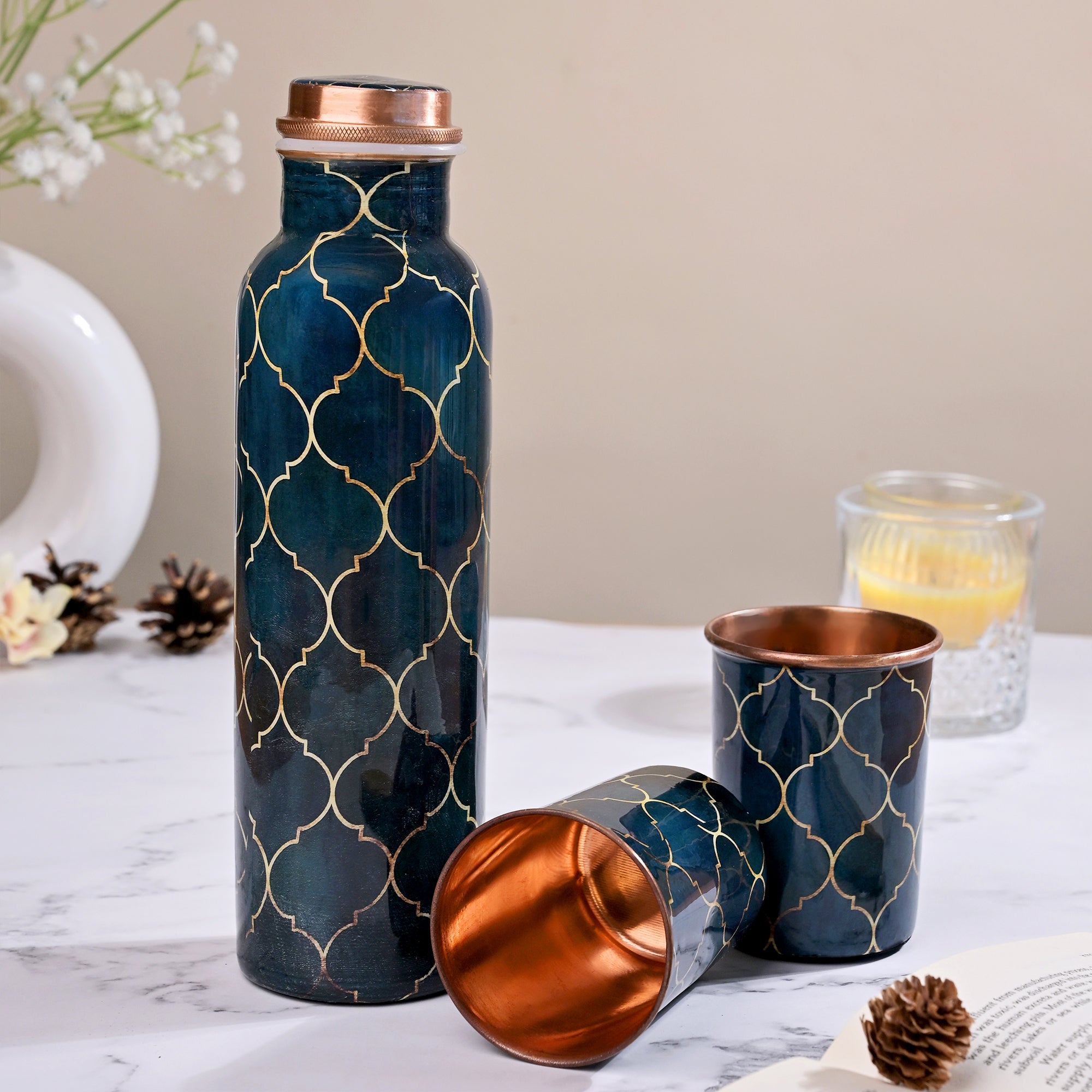 COD availableExperience classic elegance with the Navy Blue Moroccan Copper Water Bottle With Glass Set This set of three 1000 ml bottles features a sophisticated navy blue Moroccan design, combining beauty with functionality. The high-quality copper construction ensures your beverages stay fresh and pure, while the set's stylish design makes it a perfect addition to any home or office.