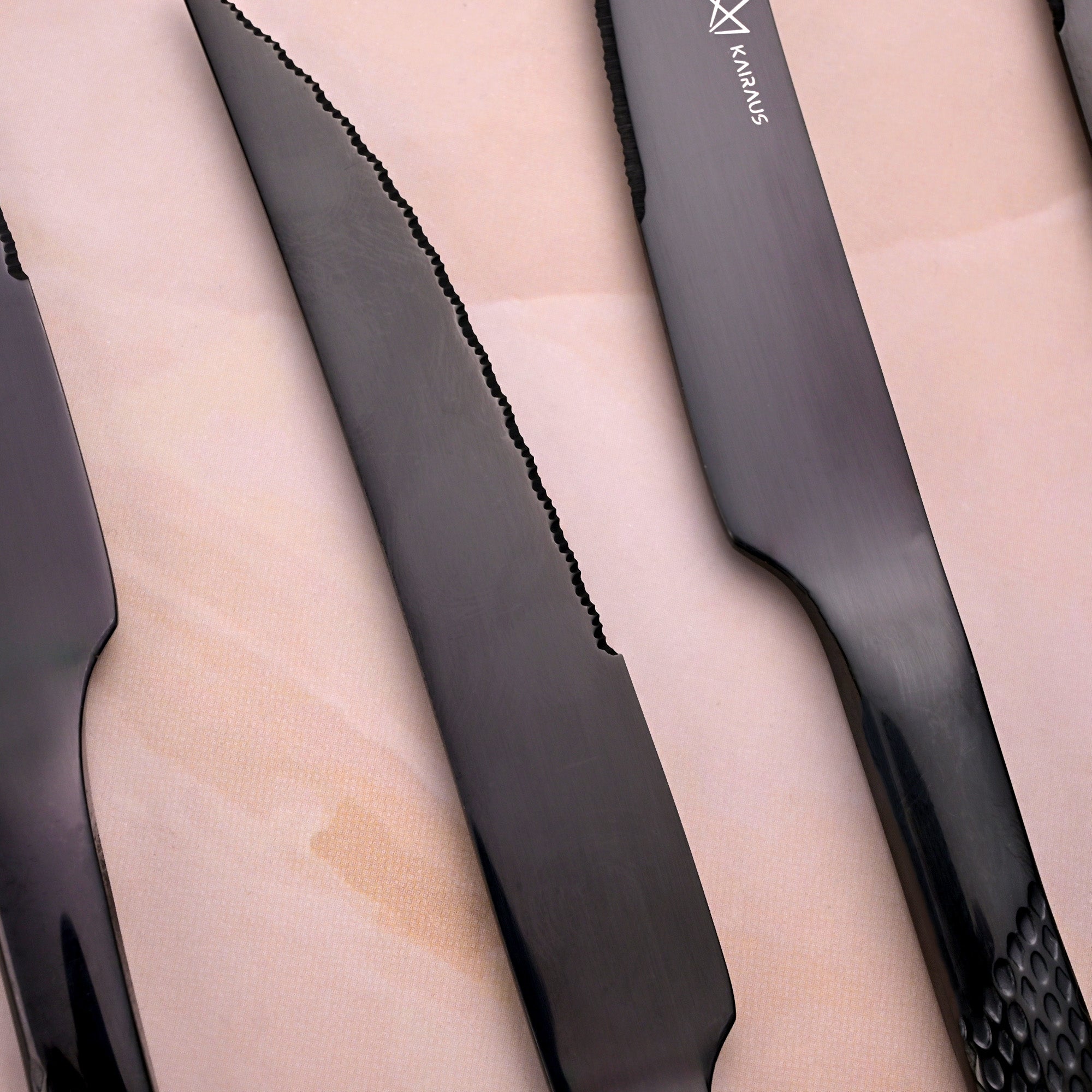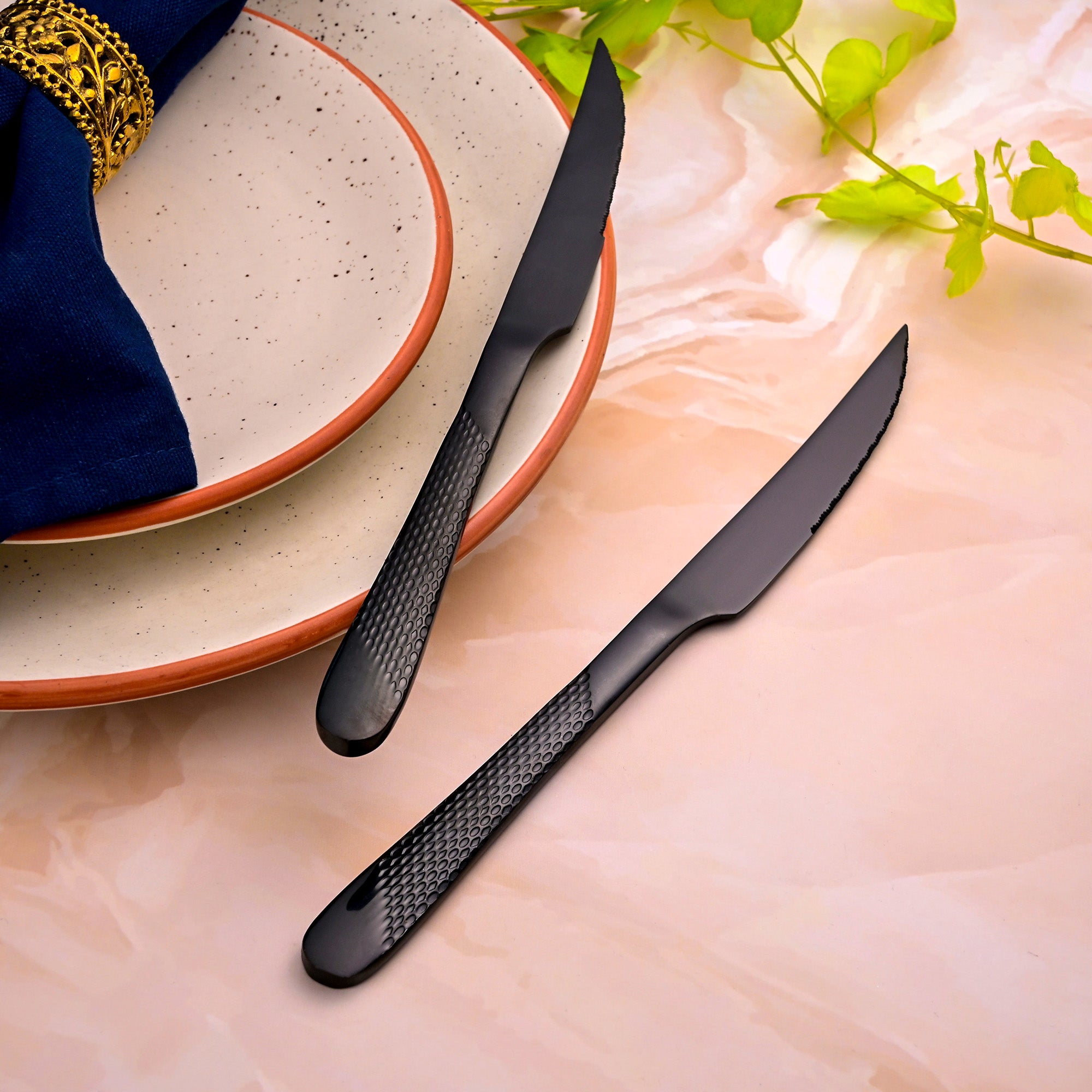 The deep black finish brings a bold, beautiful attitude to the table, if you love things with a striking edge, this knife set is made just for you. It doesn't just look stunning; it's crafted from high-quality stainless steel, making it durable and long-lasting. Whether you're hosting a dinner or just want to add a little drama to everyday meals.