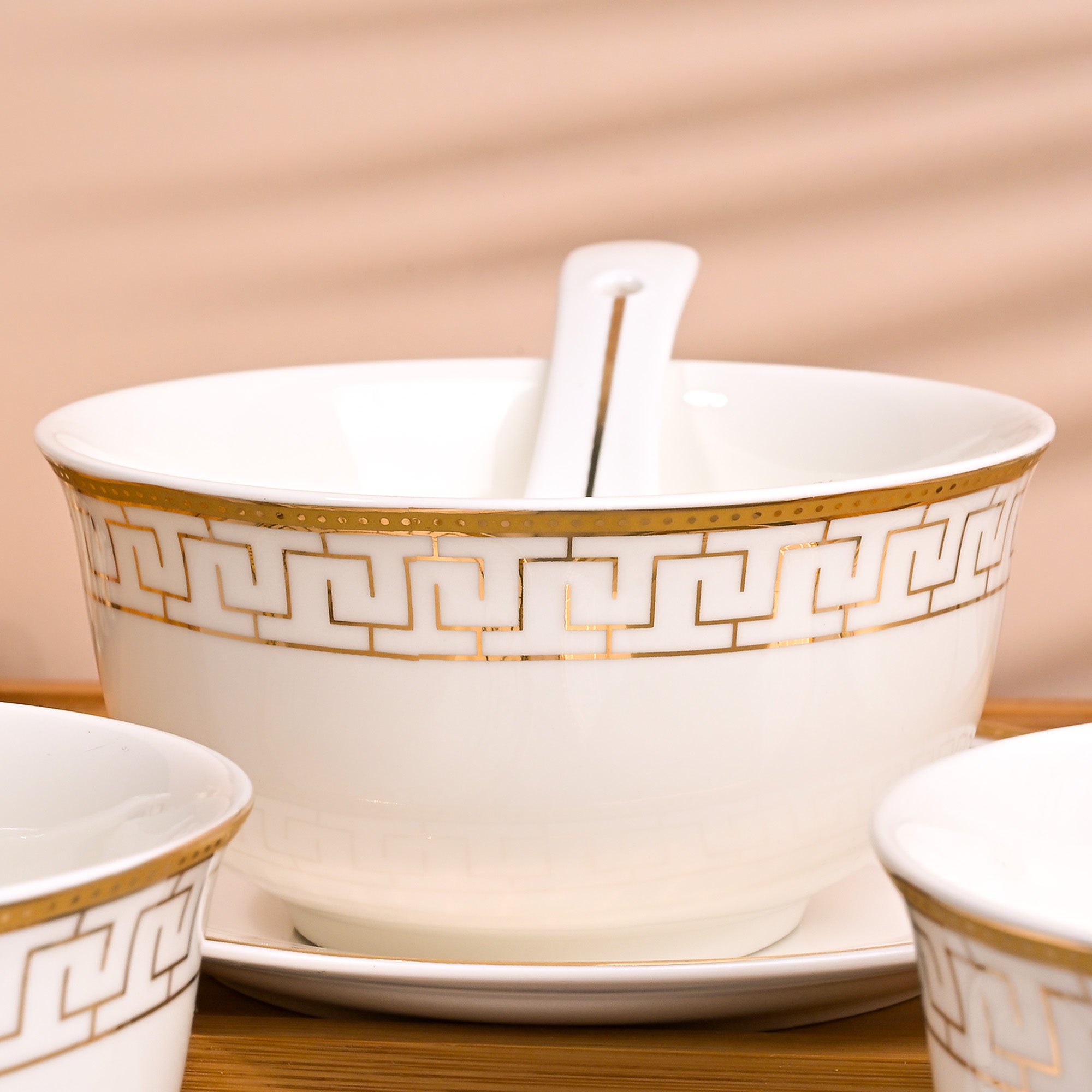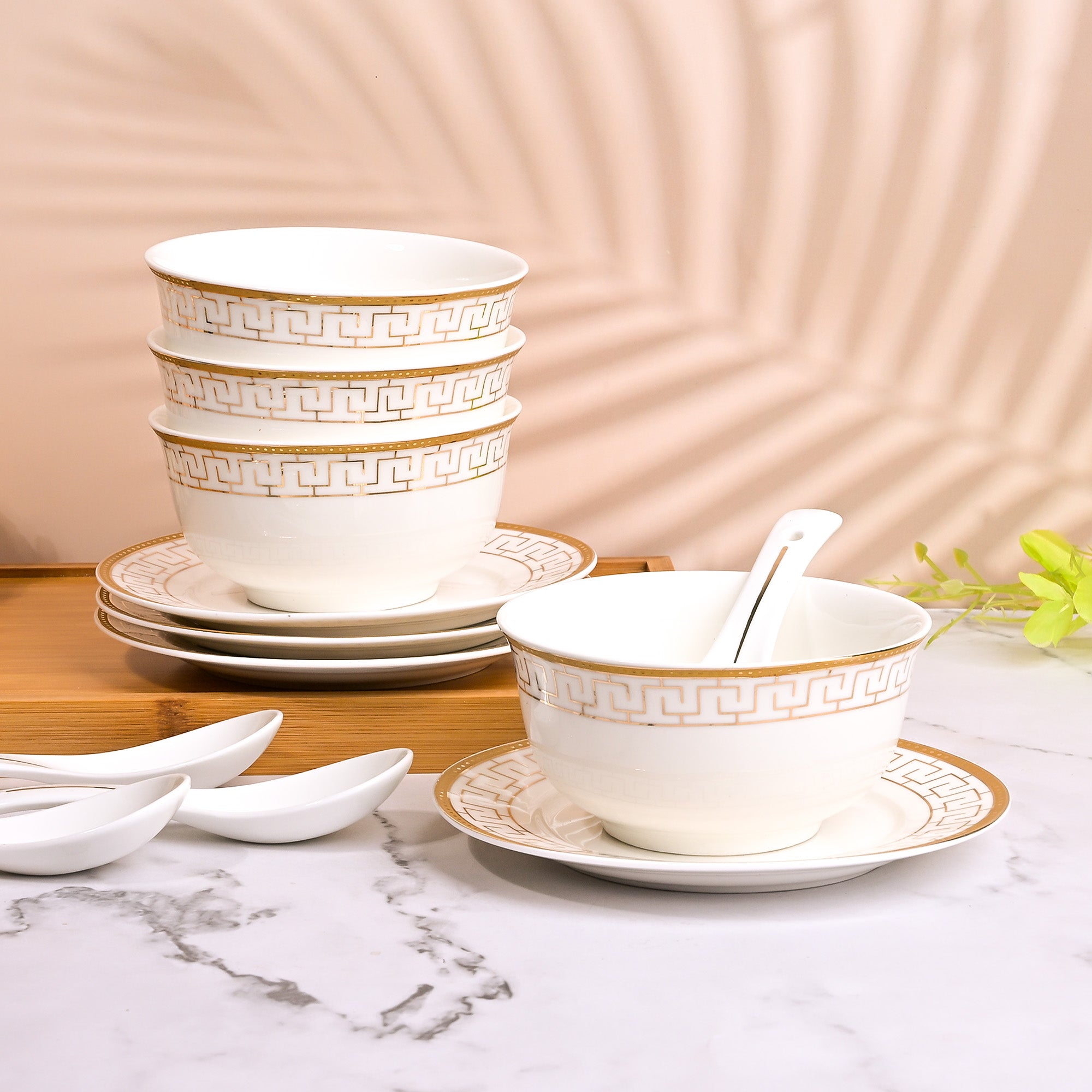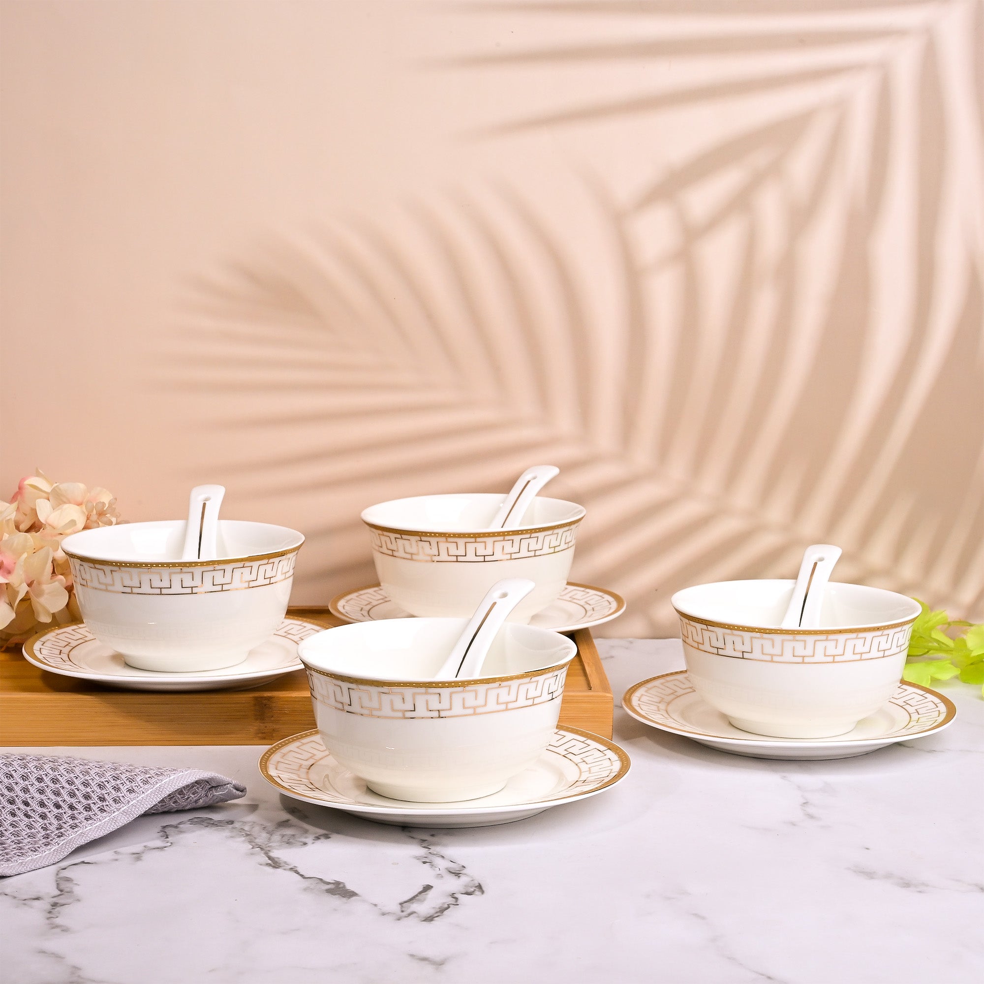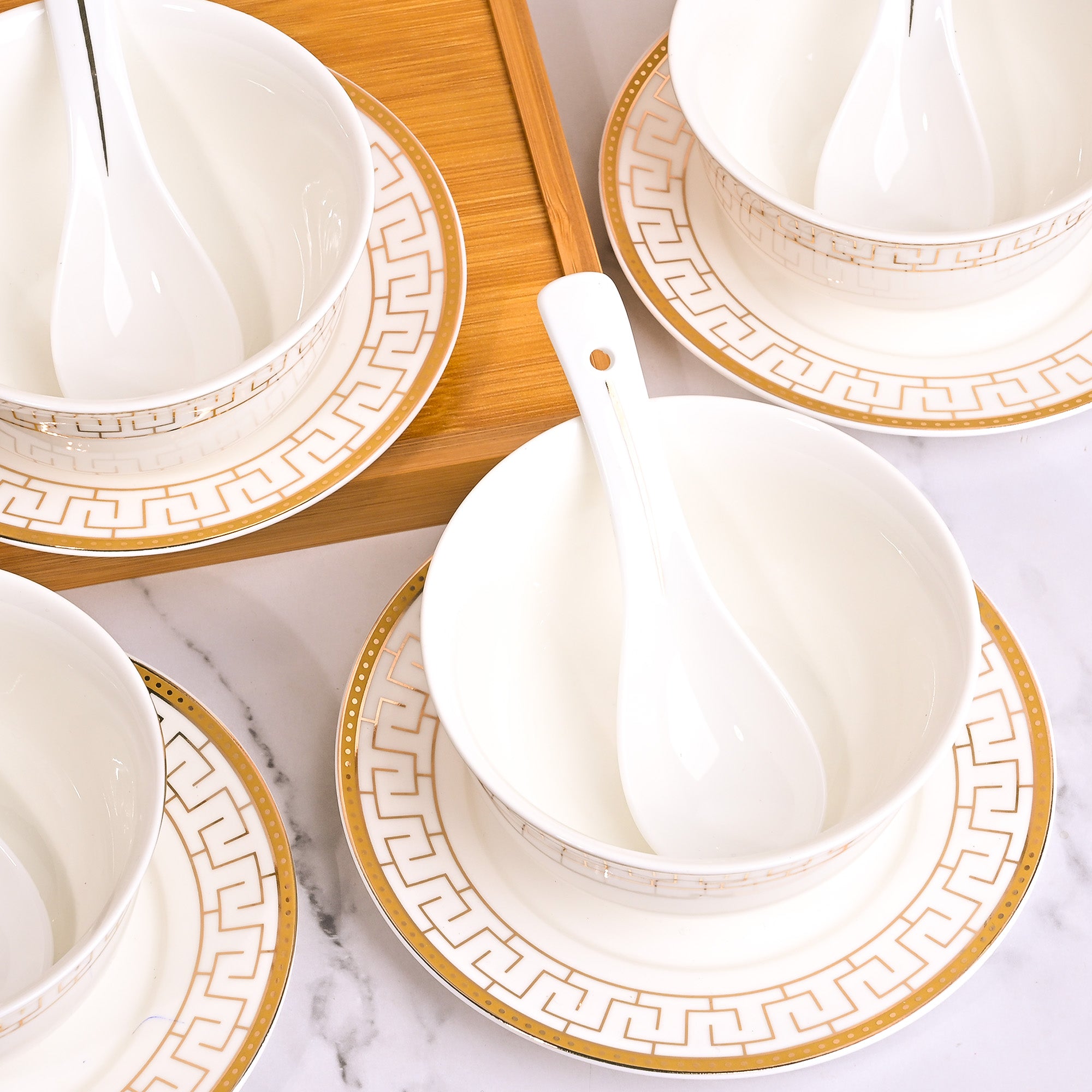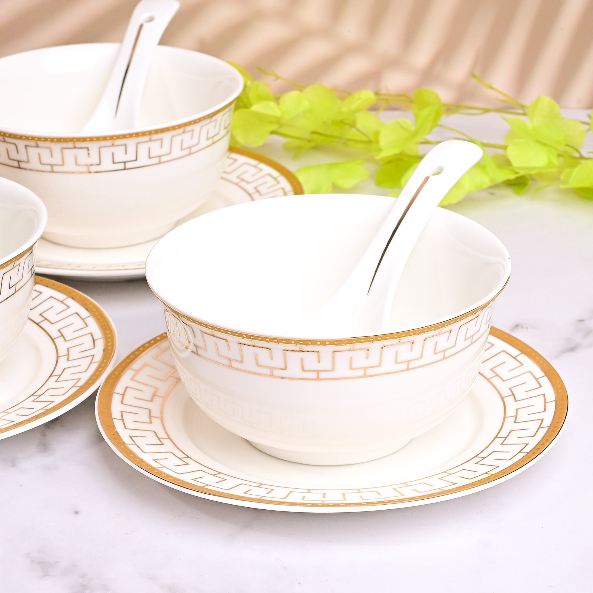 COD availableThe beauty of traditional art never goes out of style. Presenting the Greek art-inspired Opulent White Bowl, Spoon, and Saucer Set that carries timeless charm and polished look. Made from high-quality porcelain, it’s a long-lasting and durable addition to your serveware collection. This set’s elegant colour combination of white and gold brings a classic, luxurious touch to your table. The delicate Greek-key pattern encircling the bowl and plate reflects heritage artistry, while the matching porcelain spoon completes the ensemble for a seamless dining experience. Perfect for serving soups, broths, or special dishes, this set turns every meal into a refined moment to be enjoyed and remembered.