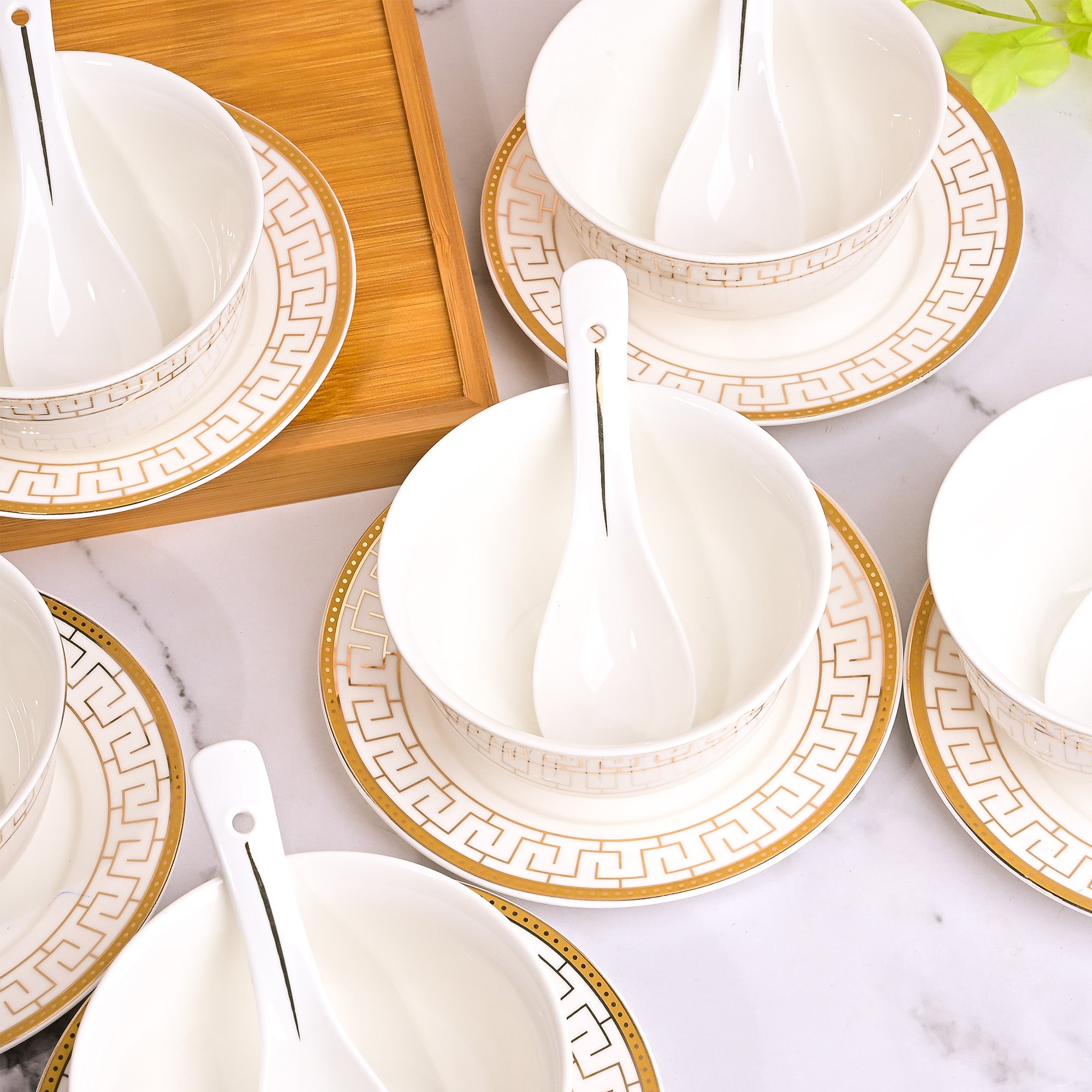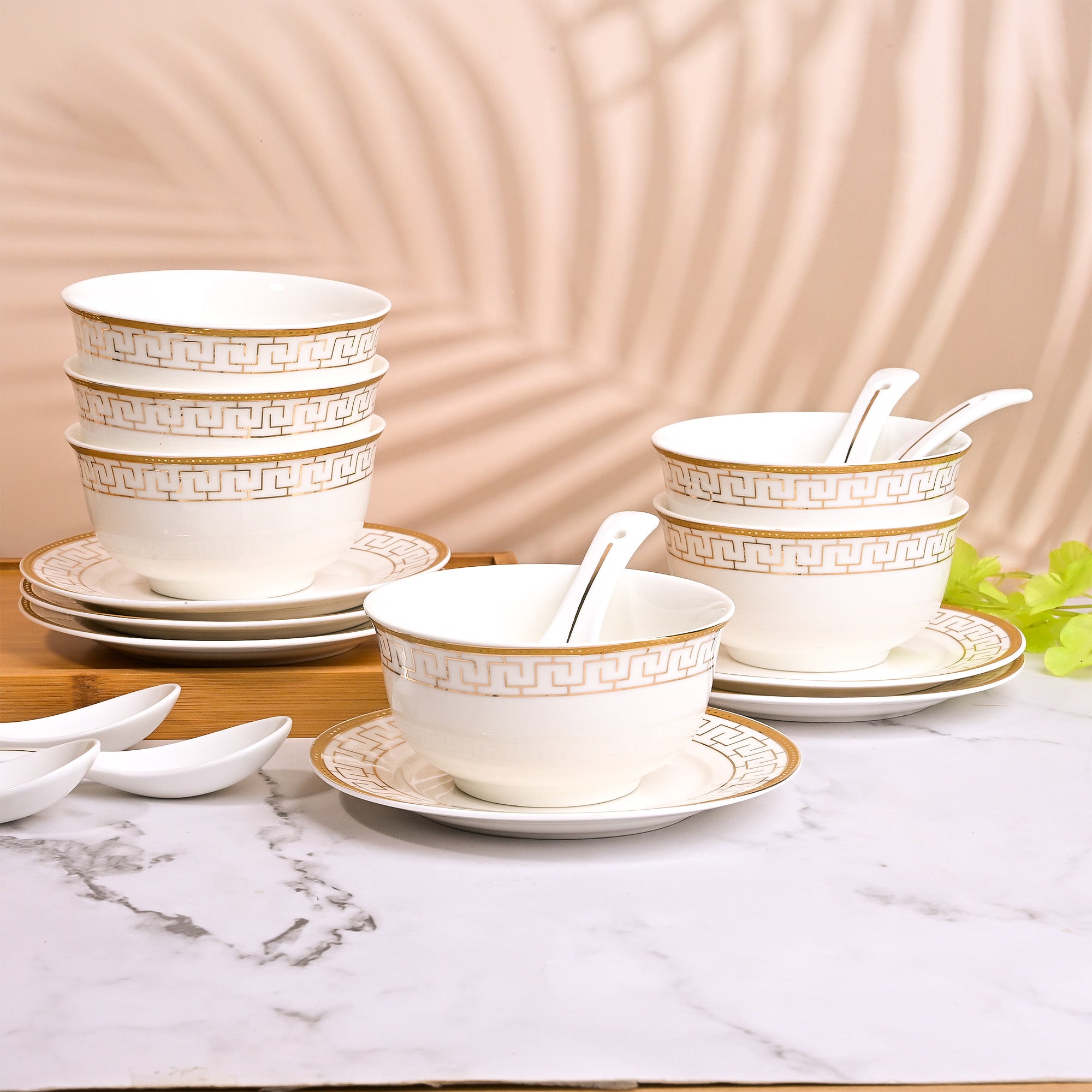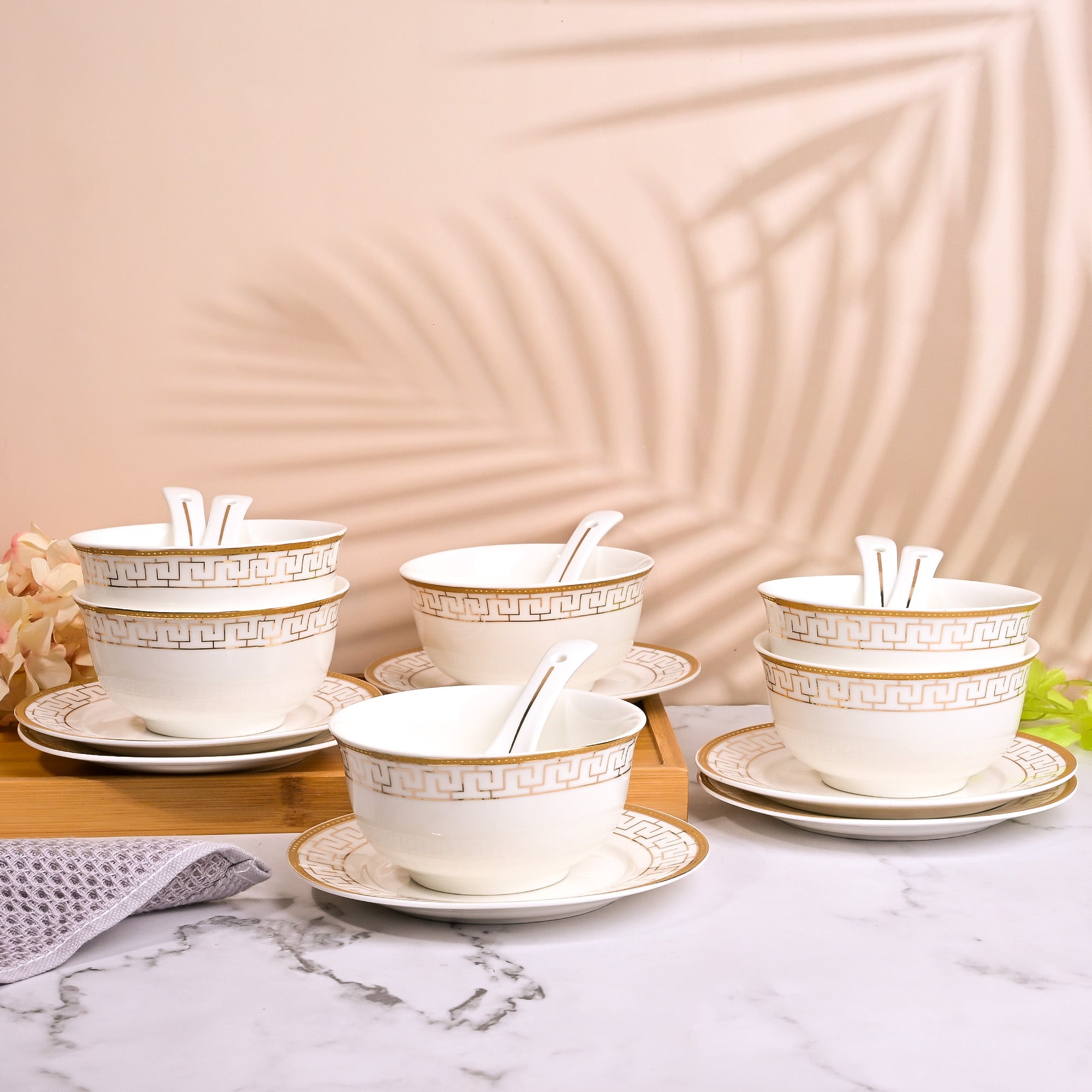 COD availableThe beauty of traditional art never goes out of style. Presenting the Greek art-inspired Opulent White Bowl, Spoon, and Saucer Set that carries timeless charm and polished look. Made from high-quality porcelain, it’s a long-lasting and durable addition to your serveware collection. This set’s elegant colour combination of white and gold brings a classic, luxurious touch to your table. The delicate Greek-key pattern encircling the bowl and plate reflects heritage artistry, while the matching porcelain spoon completes the ensemble for a seamless dining experience. Perfect for serving soups, broths, or special dishes, this set turns every meal into a refined moment to be enjoyed and remembered.