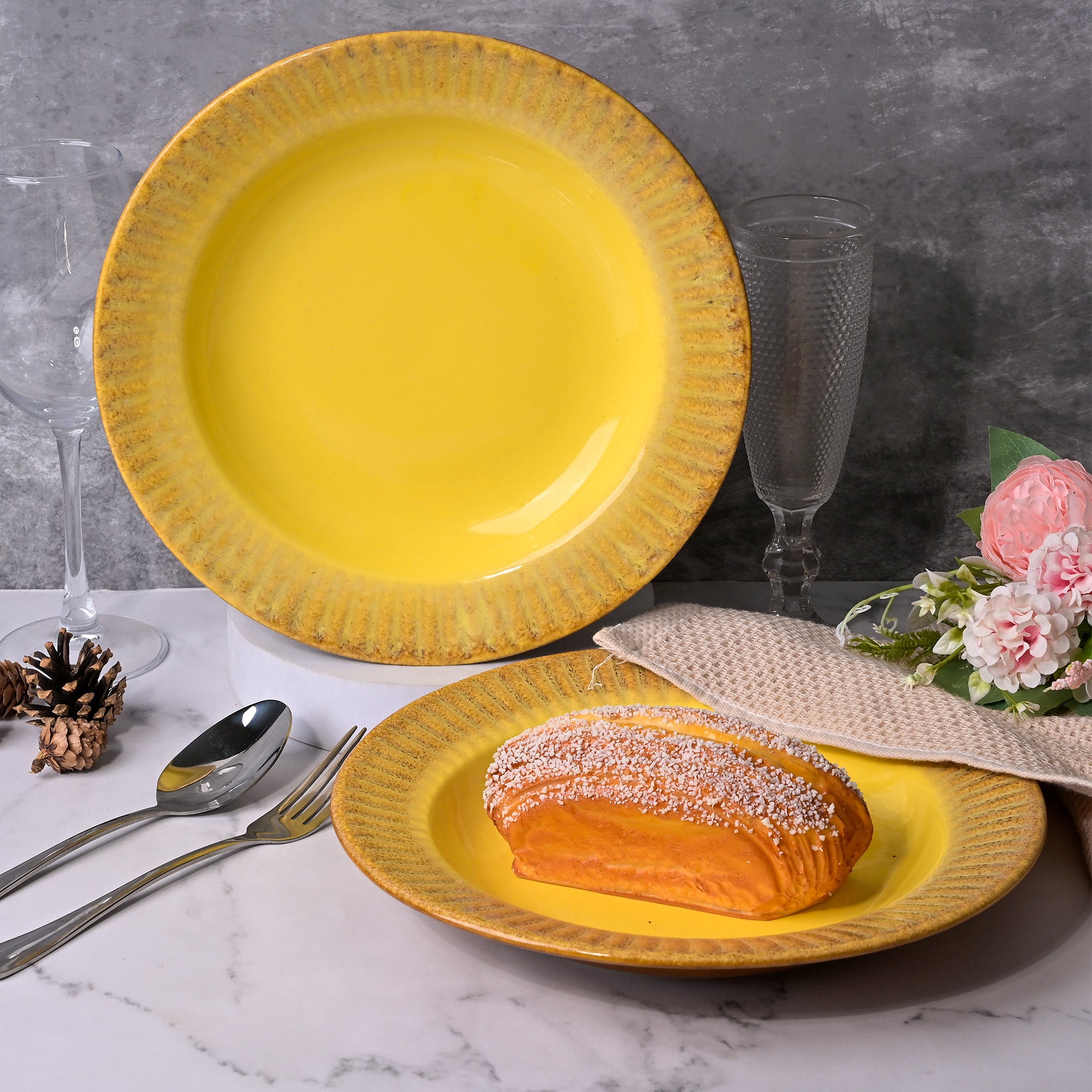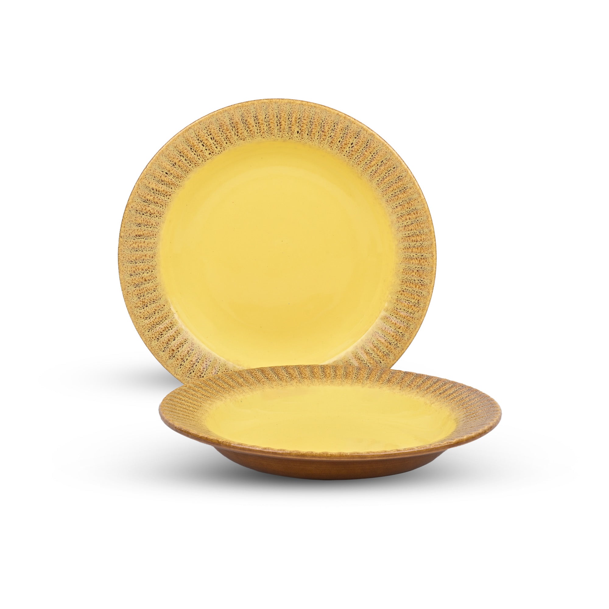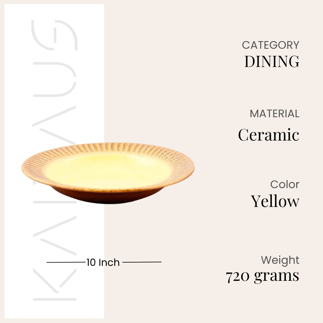 COD availableThe sun lights up the entire world, right? Now let this sun-inspired Pastel Yellow Ceramic Pasta Plate set brighten your dining table too. We present to you this pasta plate set, crafted with an earthy blend of colours. A subtle yellow centre that glows gently, framed by a beige border reflecting the rustic charm of every meal. It’s perfect for serving dishes with love, like pasta, noodles or anything else you like. Whether it’s a hearty breakfast or a special dinner, these plates are ideal for all occasions. Made from high-quality ceramic, they’re durable and sturdy for daily use, offering lasting quality.