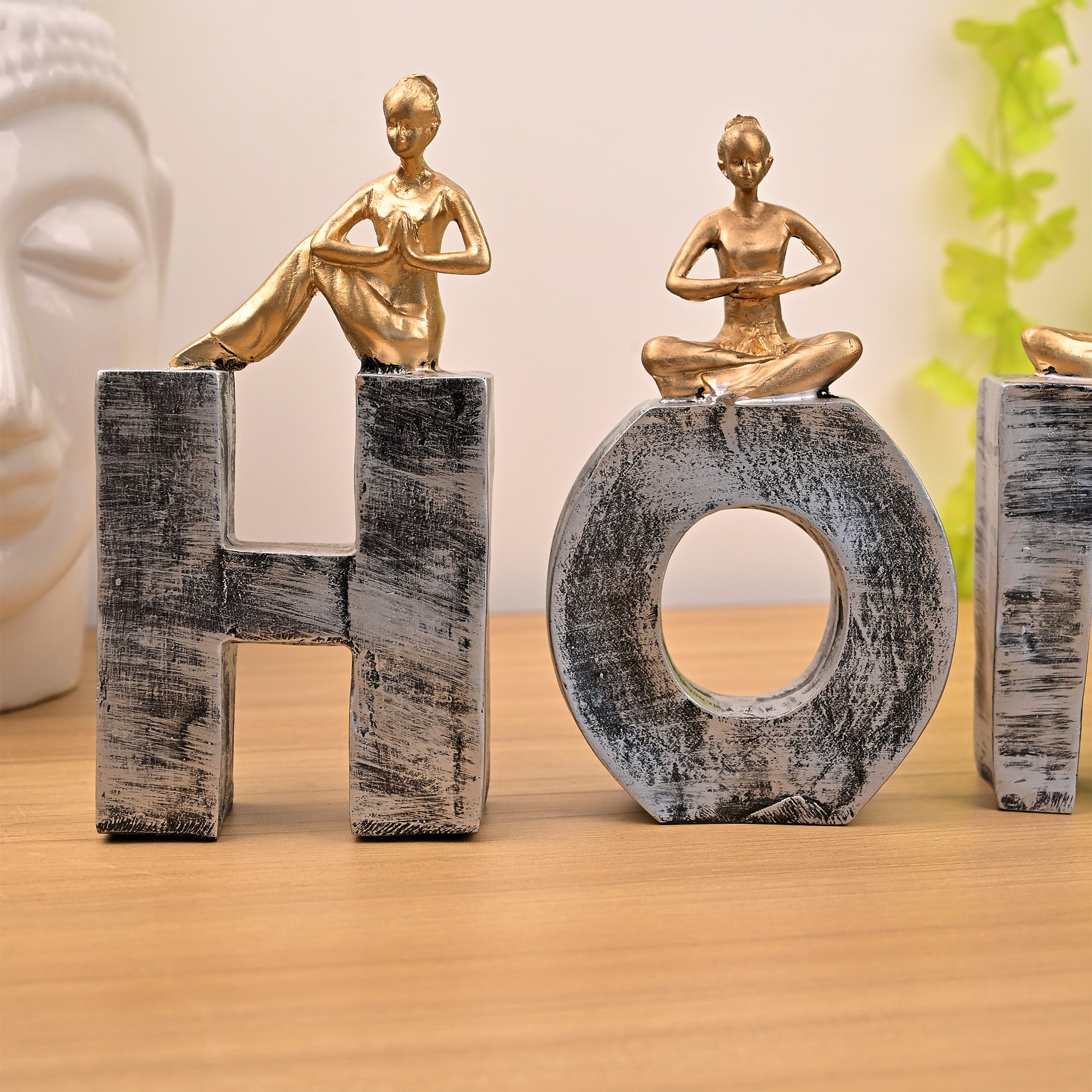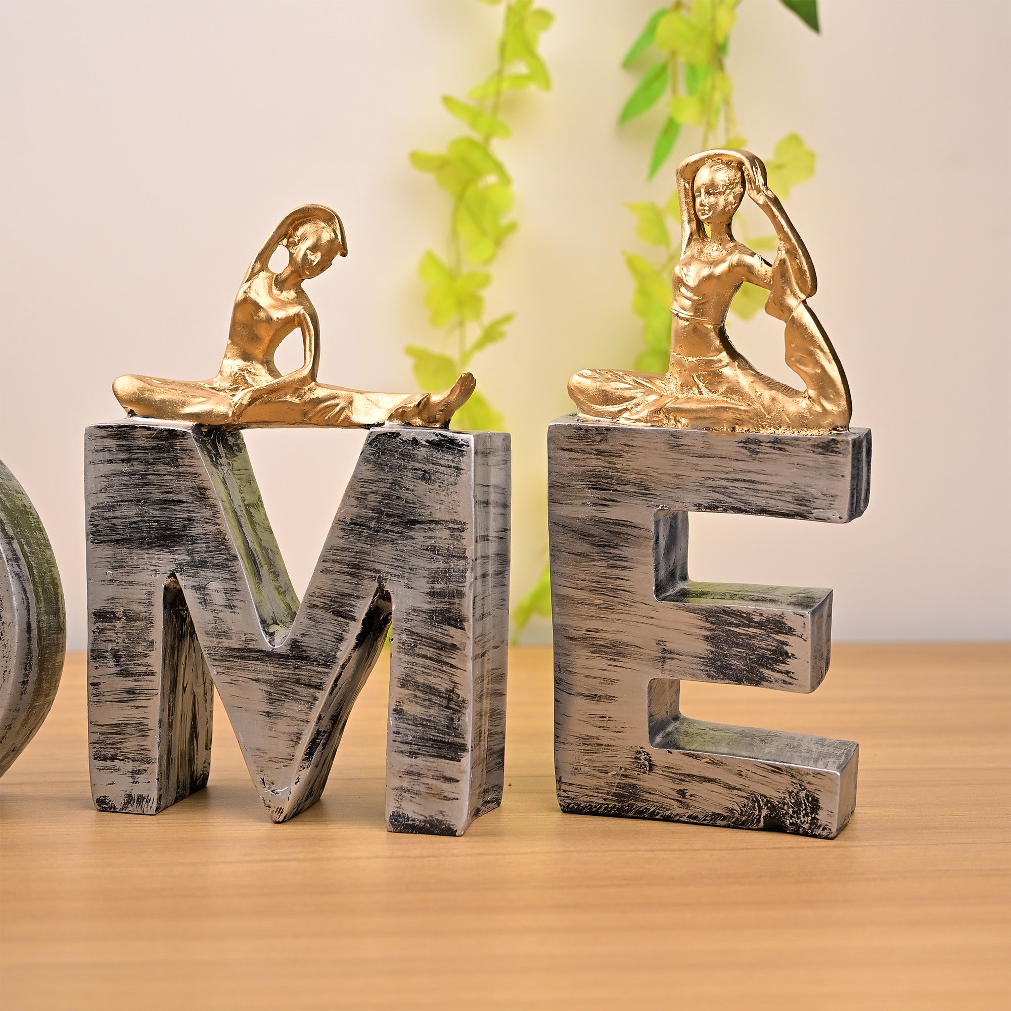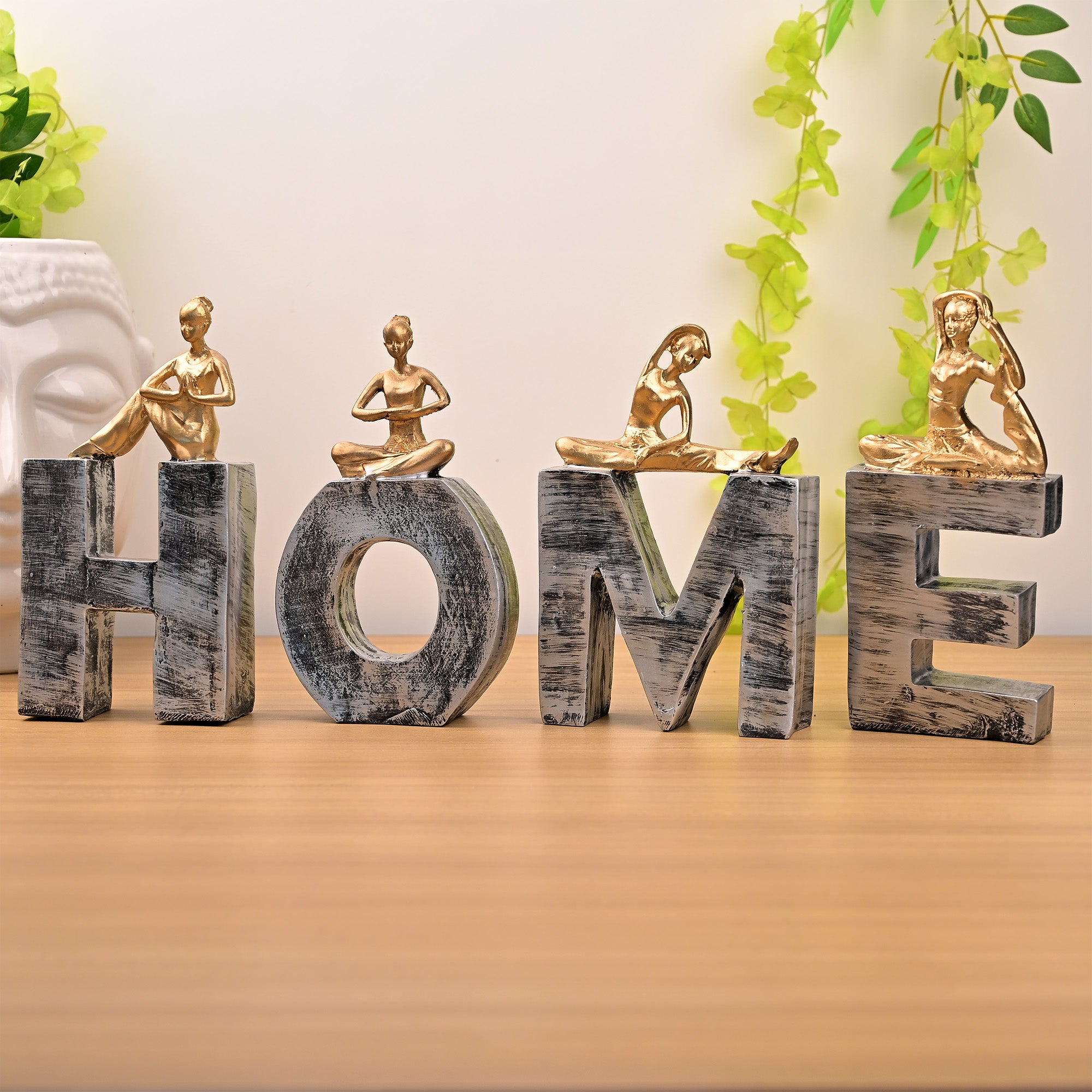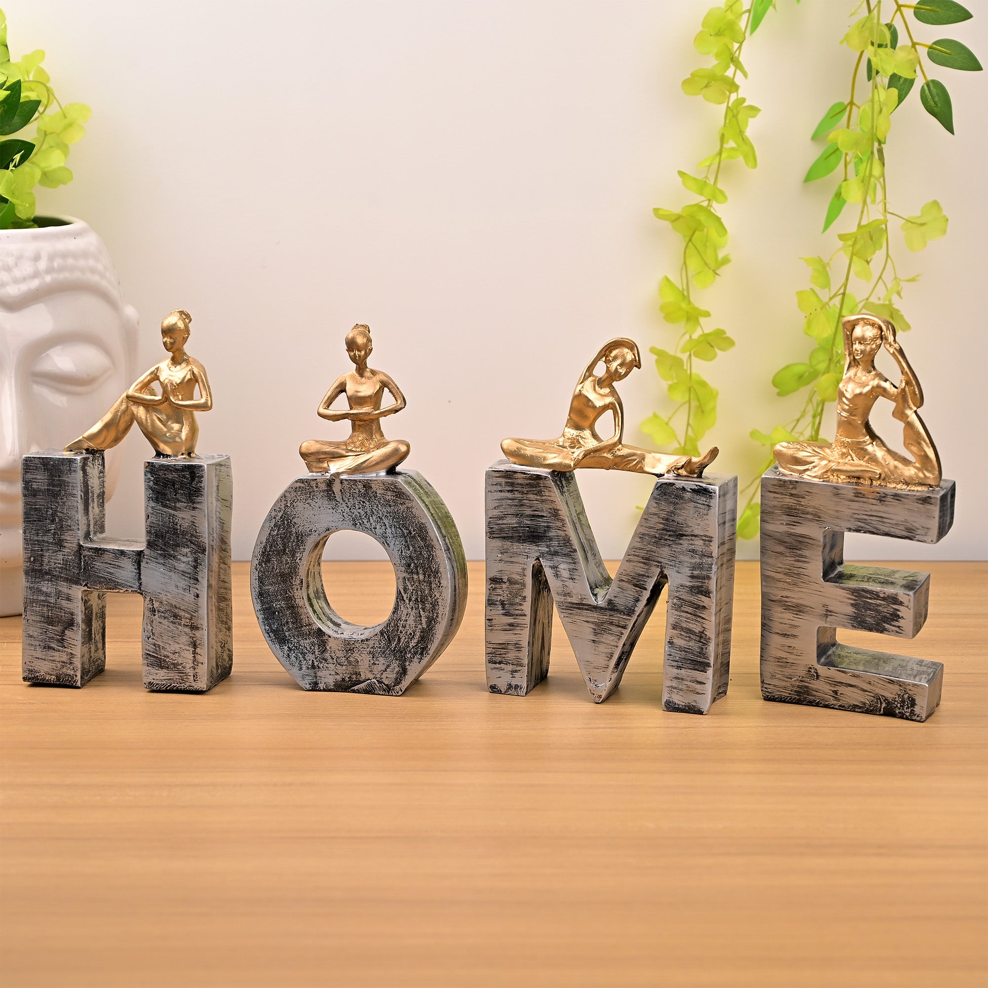 COD availableIntroduce a touch of peace, balance, and harmony within your living space with the 'Peaceful Home Yoga Letters.' This unique showpiece spells 'HOME' with each letter embellished with a figurine gracefully performing a yoga pose. The statues are elaborated in calming grey and lustrous gold hues. The piece represents a state of calm and relaxation, enhancing the decor of your home. It also makes a thoughtful gift for yoga enthusiasts and practitioners seeking a serene environment.