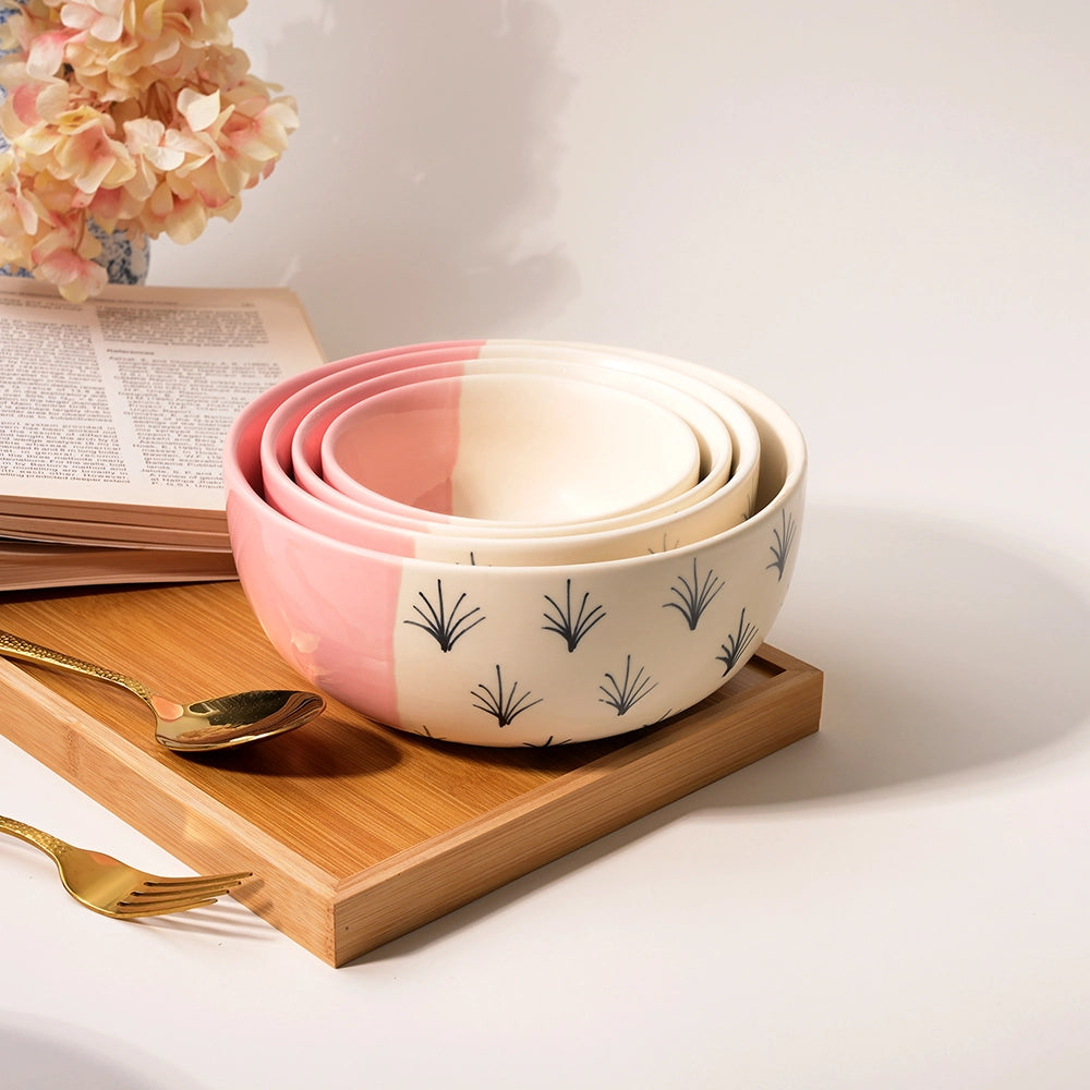 COD availableYes, you might be wondering which of our treats inspired these colours. It’s true, the shades chosen for this Premium Blush Pink Bowl set are often seen in biscuits and other delicious goodies, and this set is a little reminder of them. Made from high-quality ceramic, it keeps your food safe and warm for a long time. The appealing blush pink and off-white combination makes it stand out beautifully. What sets it apart is the unique, funa design on the white side that brings a touch of freshness and a subtle dessert vibe to your table. Perfect for serving a variety of dishes, this set of four bowls adds versatility and a unique style to your everyday or special occasion dining.