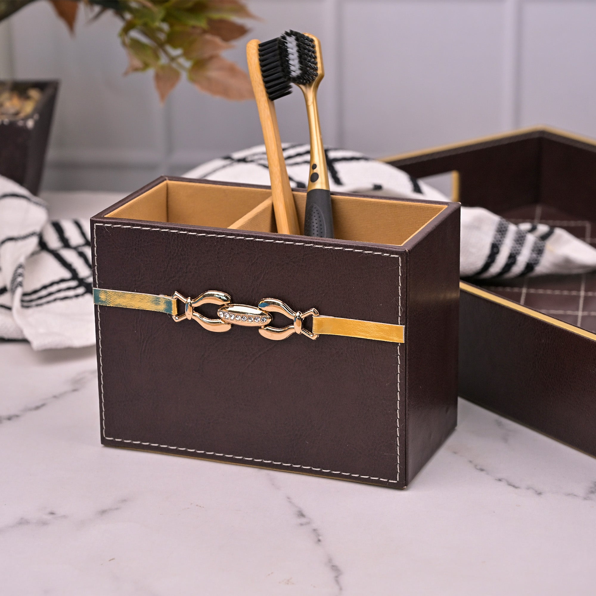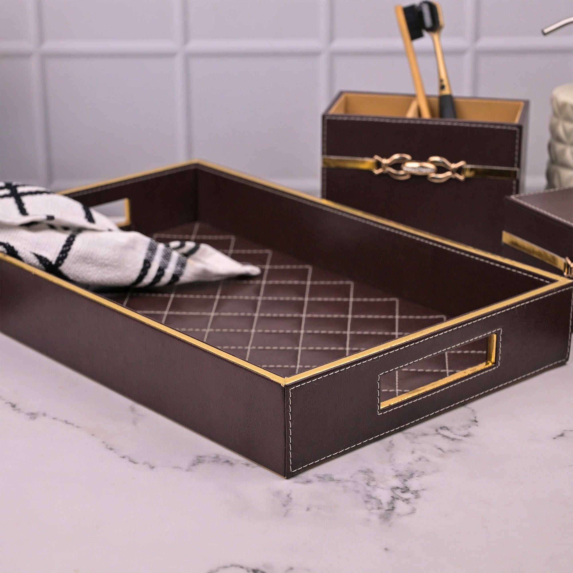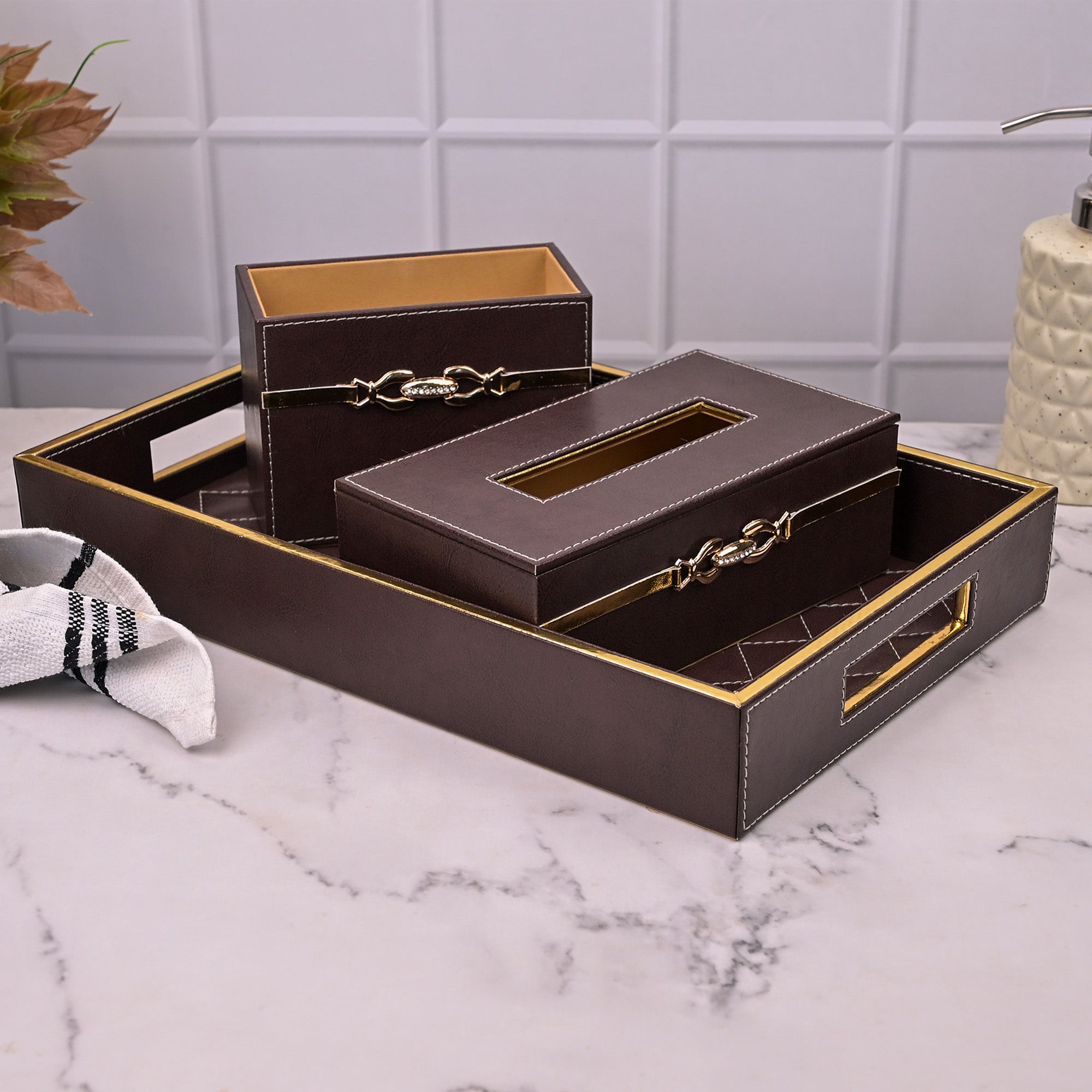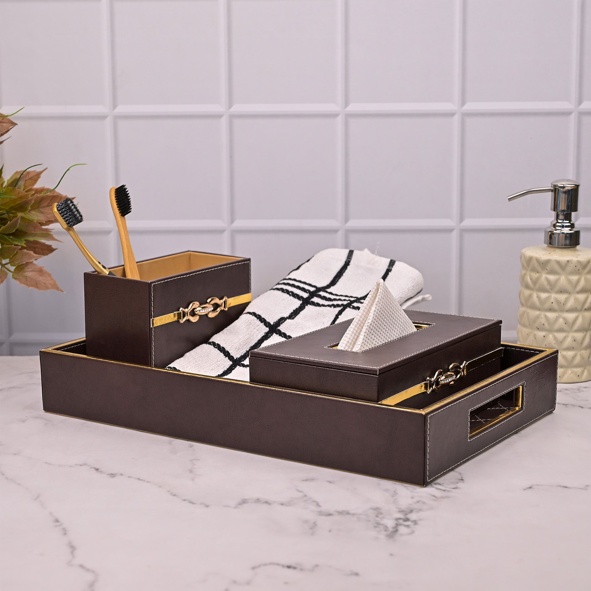 COD availableThis Premium Black Leather Bathroom Accessory Set includes a versatile Maroon tray featuring a matching Maroon cloth interior. Designed to enhance your bathroom decor, it functions effectively as a tray, a storage box, and a tissue holder. Its refined craftsmanship not only provides practical organization but also adds a touch of sophistication to your space.