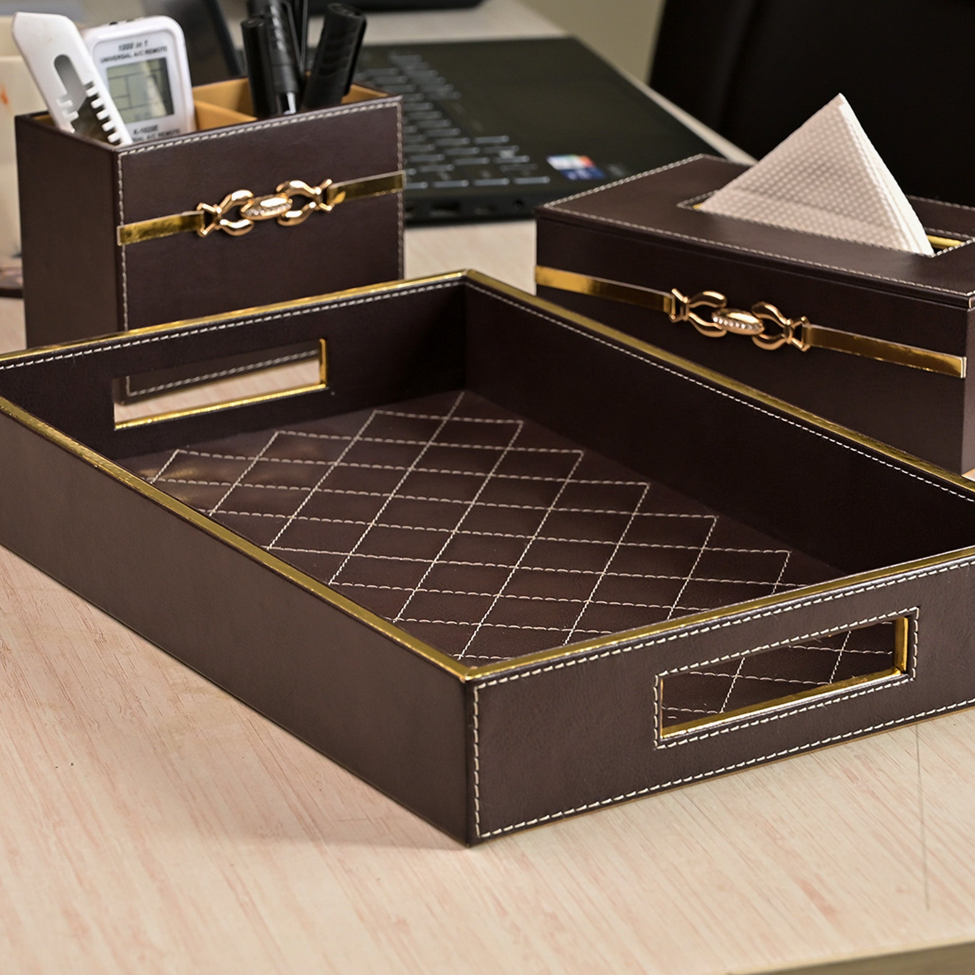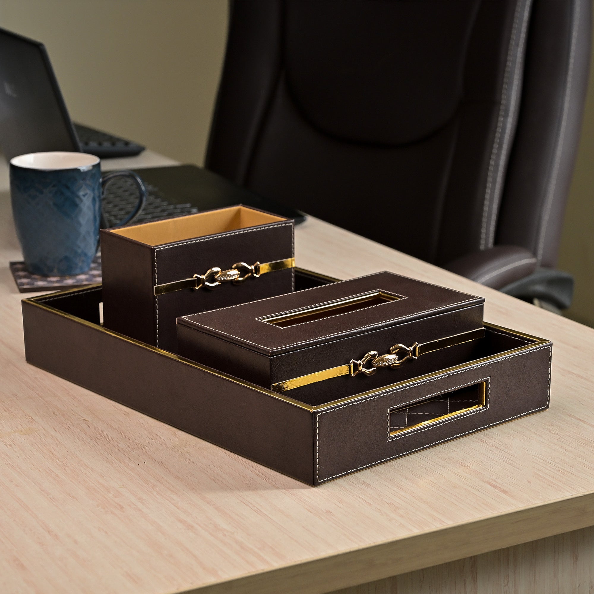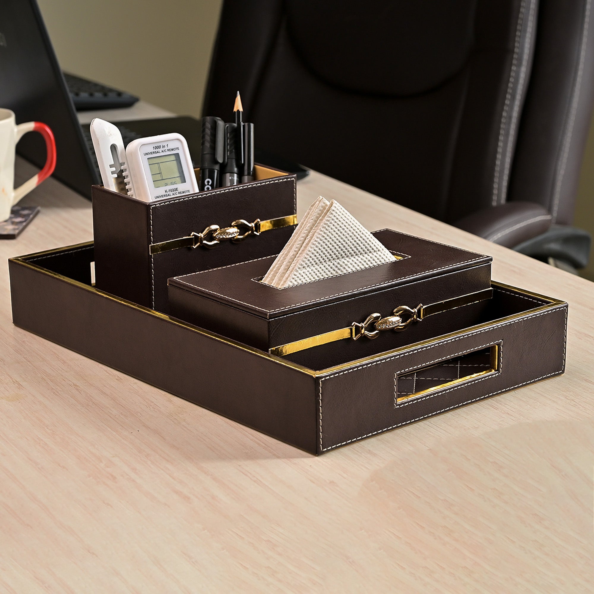 COD availableThis Premium Black Leather Desk Organiser Set includes a versatile black tray featuring a matching black cloth interior. Designed to enhance your desk decor, it functions effectively as a tray, a storage box, and a tissue holder. Its refined craftsmanship not only provides practical organization but also adds a touch of sophistication to your space.