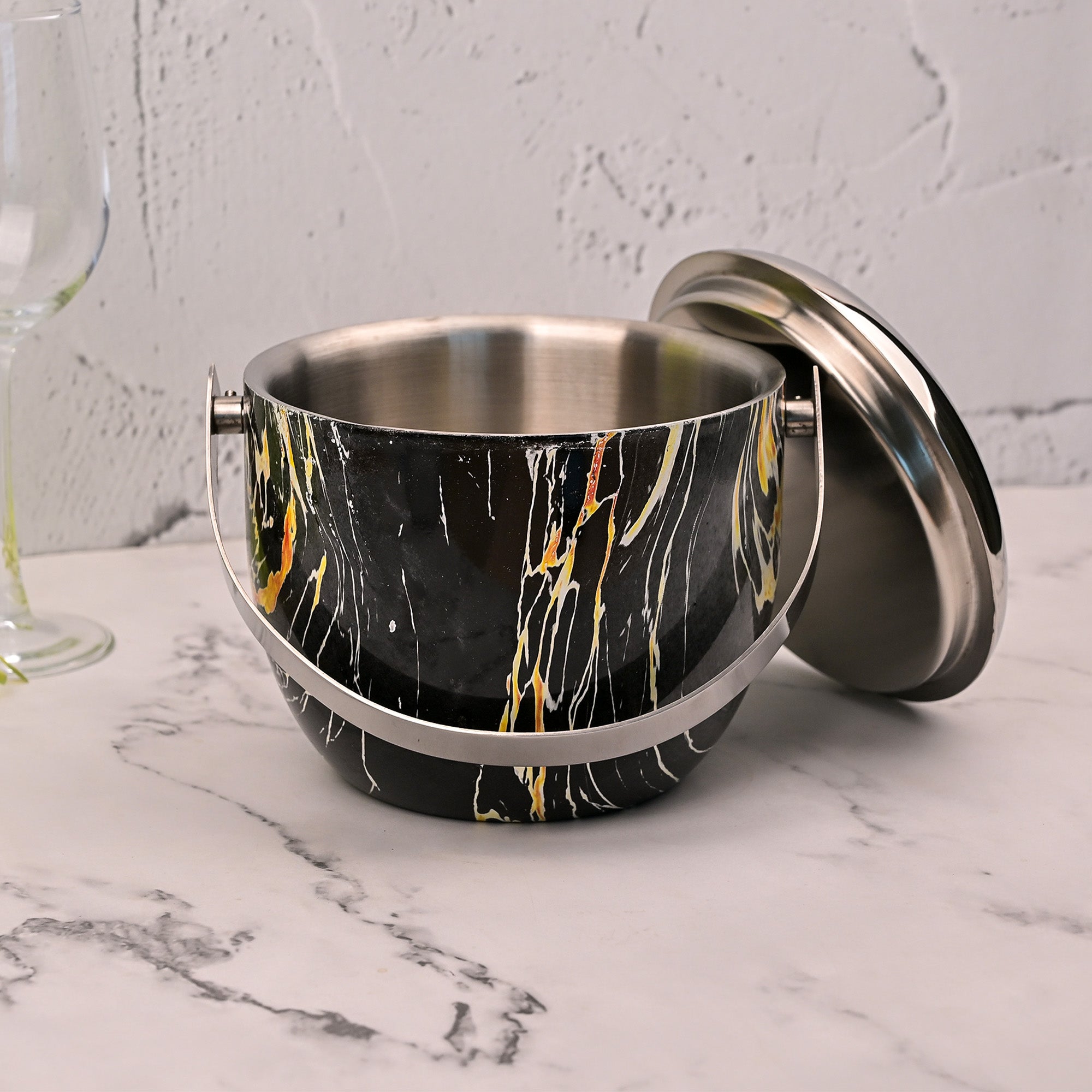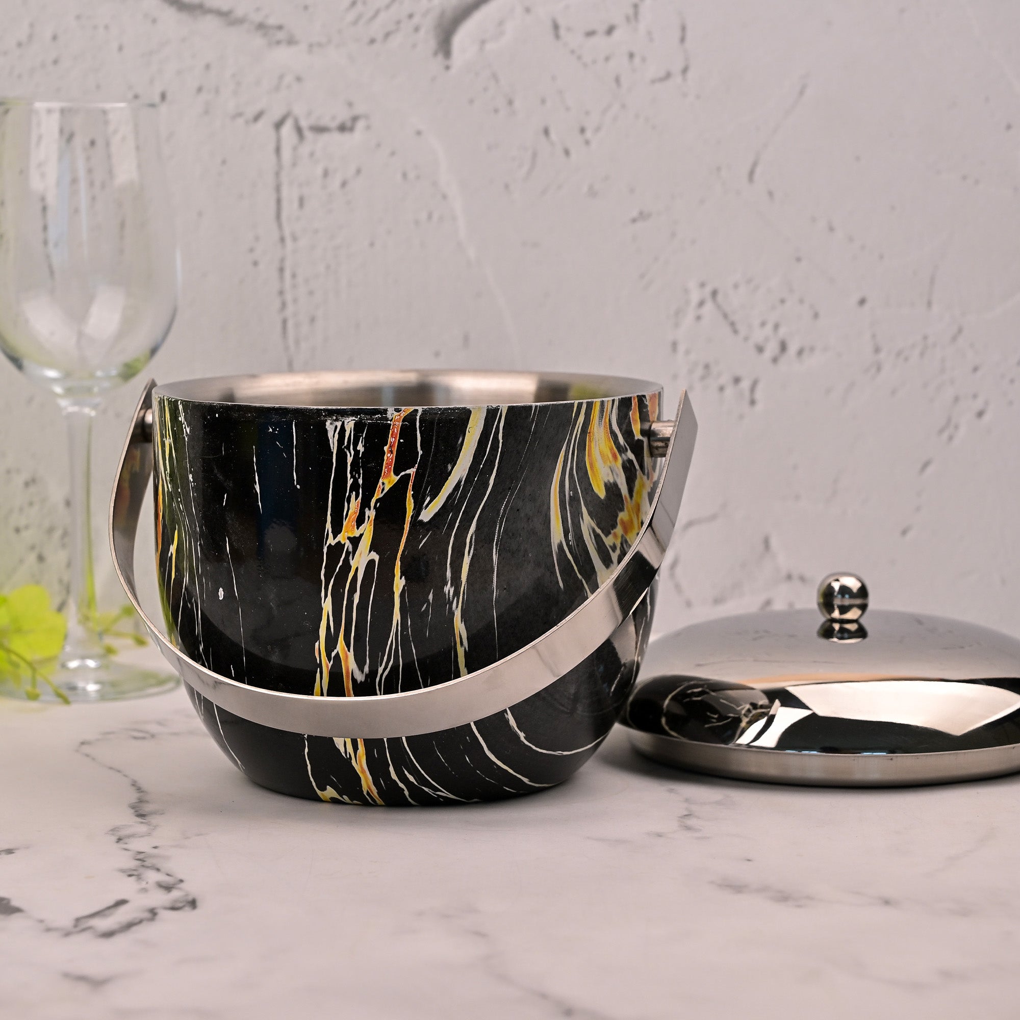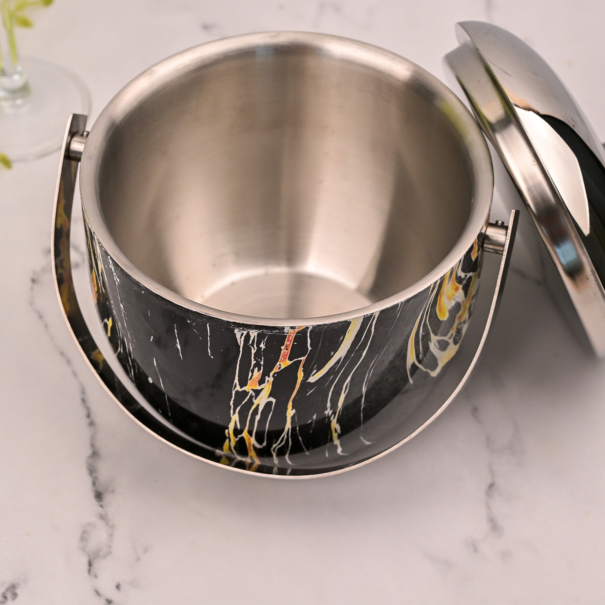 COD availableIntroducing our Premium Stainless Steel Ice Bucket, a perfect blend of elegance and functionality. Crafted from high-quality stainless steel, this ice bucket features a sleek black and yellow marble design, complemented by a sturdy handle for easy transport. Ideal for entertaining guests or enhancing your home bar, this stylish accessory keeps your beverages chilled while adding a touch of sophistication to any setting.