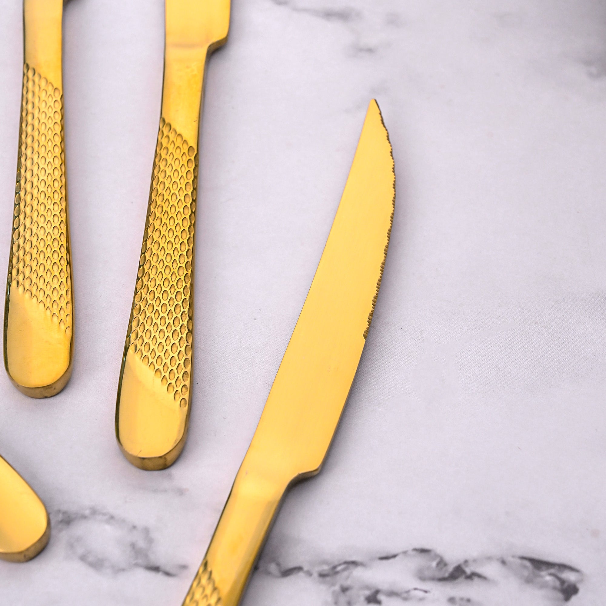 COD availableGold is the symbol of royalty and the Radiant Gold Stainless Steel Knife is a true showstopper. With its glossy gold finish and premium stainless steel body, this knife adds a touch of elegance to every dining moment. The hammered-texture handle not only enhances grip but also makes it a versatile fit for dinners, lunches, or even your everyday meals.