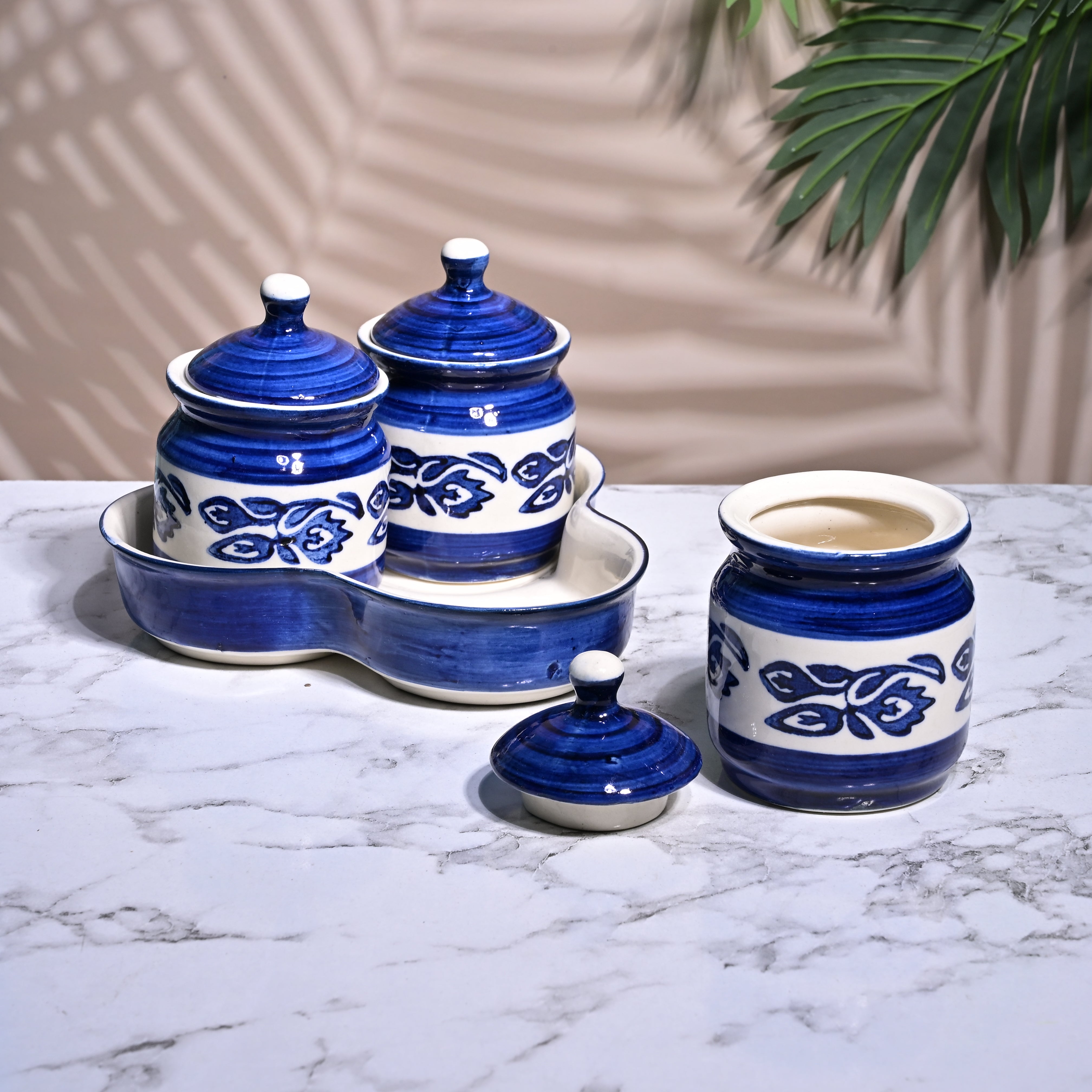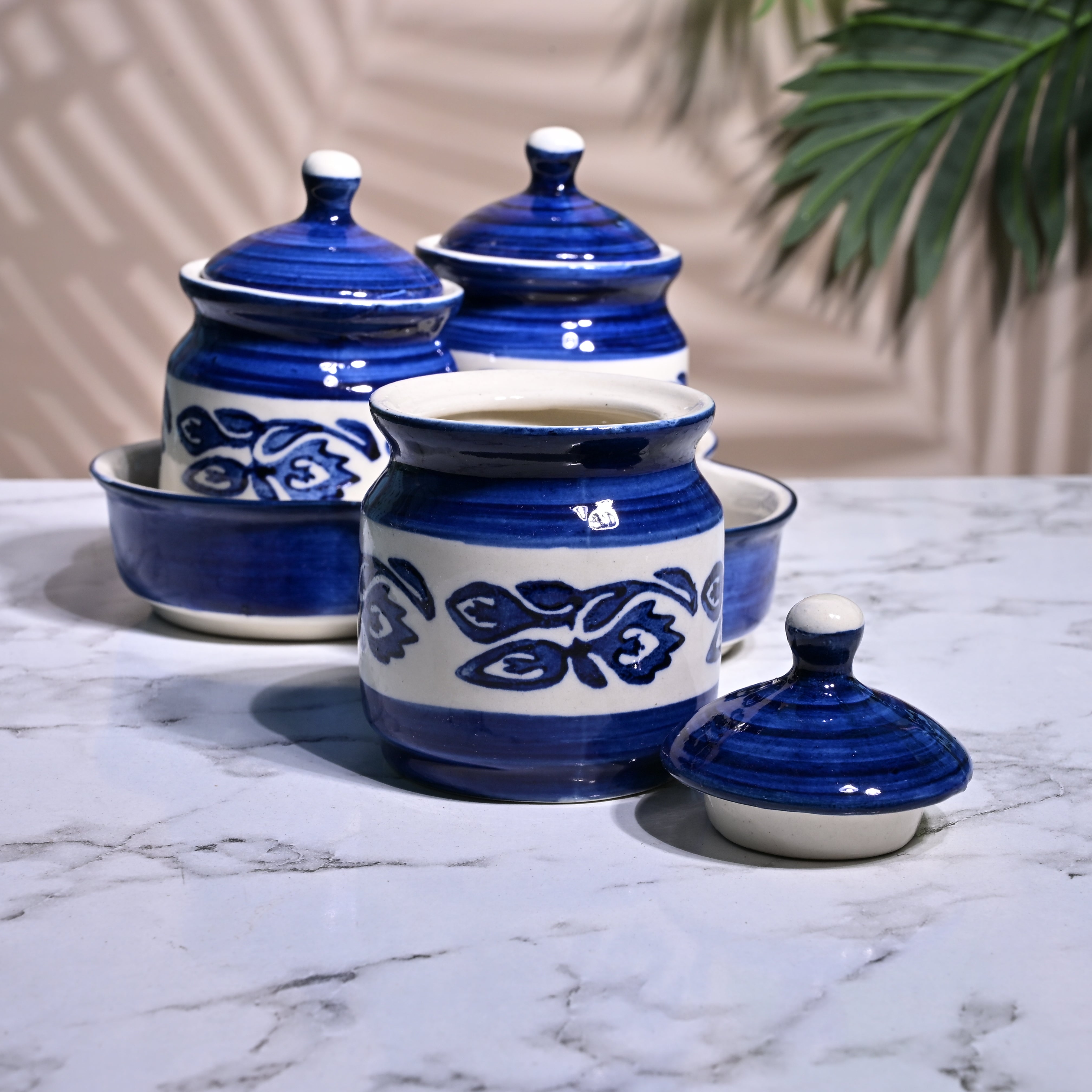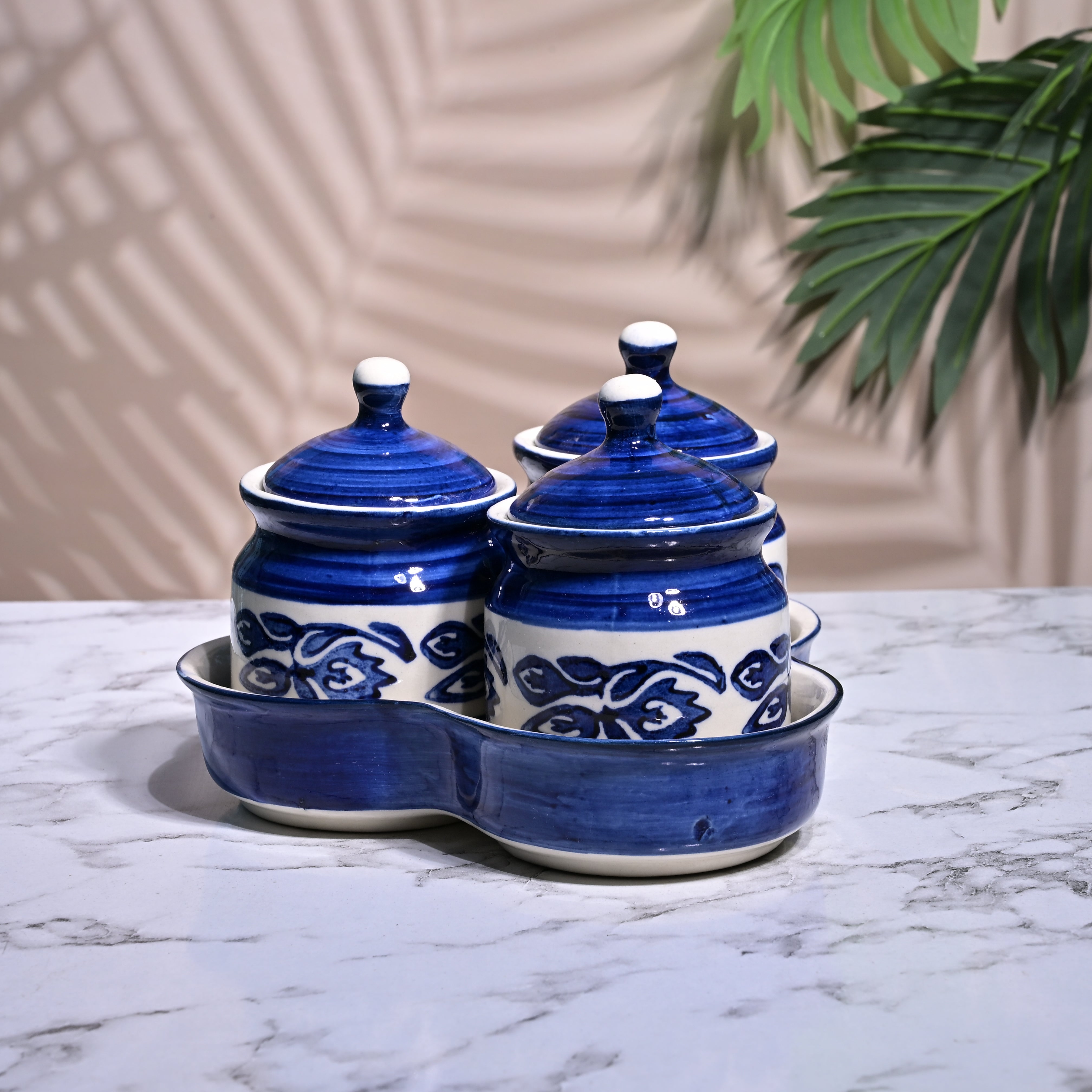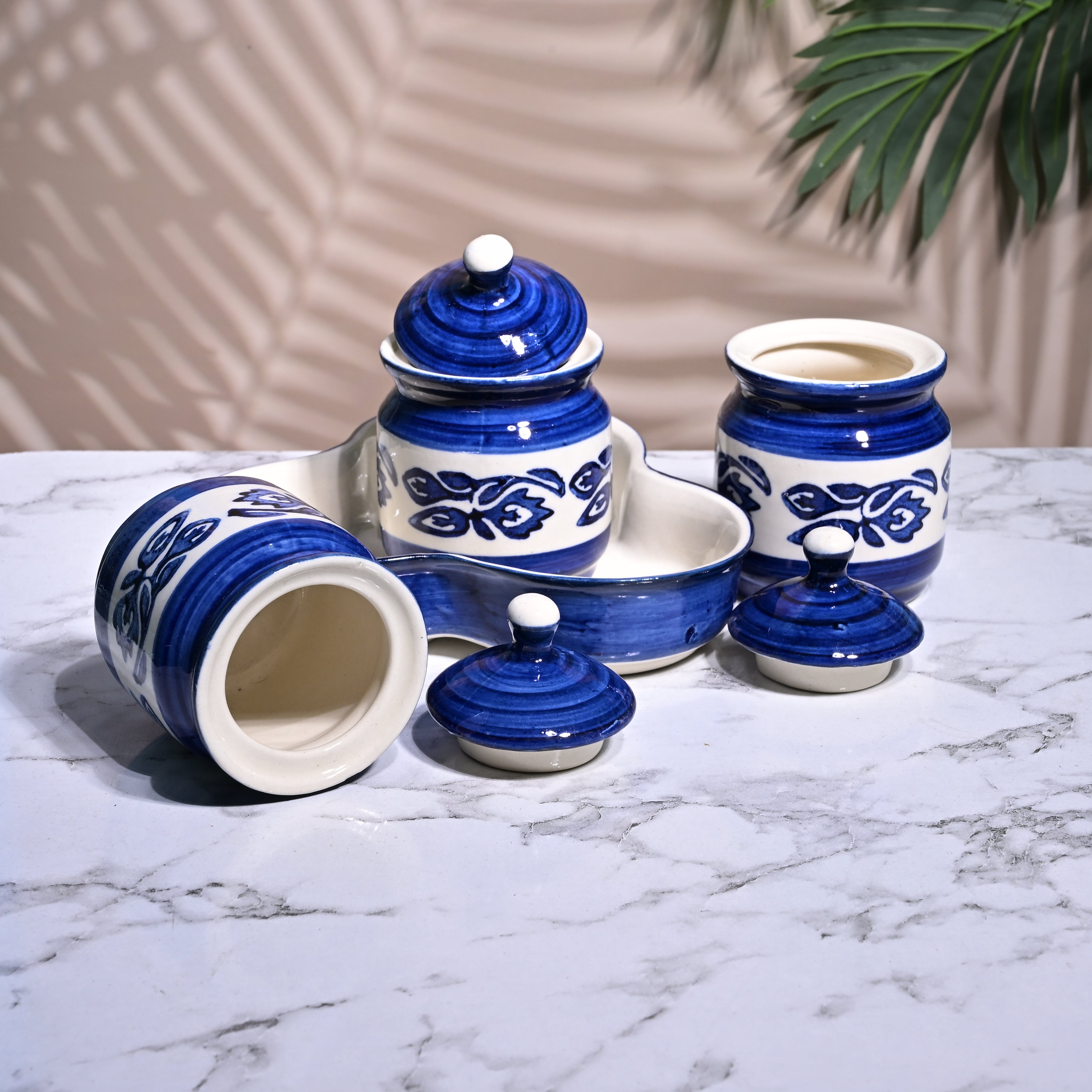 COD availableTransform your kitchen with the Royal Blue Elegance Hand-Painted Condiment Set. This exquisite collection features three intricately hand-painted ceramic jars, each adorned with a vibrant blue floral design that exudes sophistication. The set comes with a matching tray, offering both beauty and practicality for storing and serving your favorite pickles, chutneys, or condiments. The fine craftsmanship and elegant design make these jars not just functional, but also a striking addition to your dining or kitchen decor.