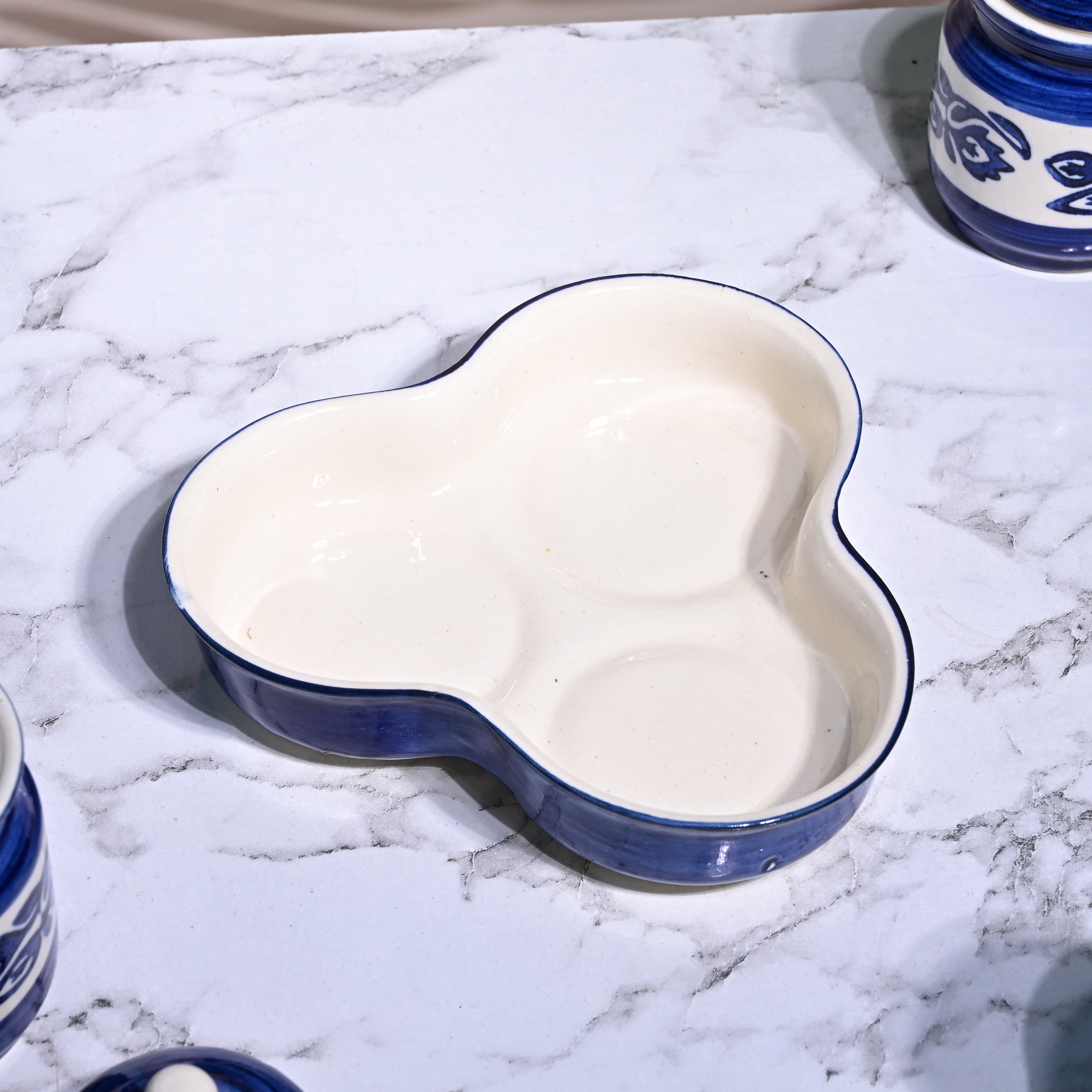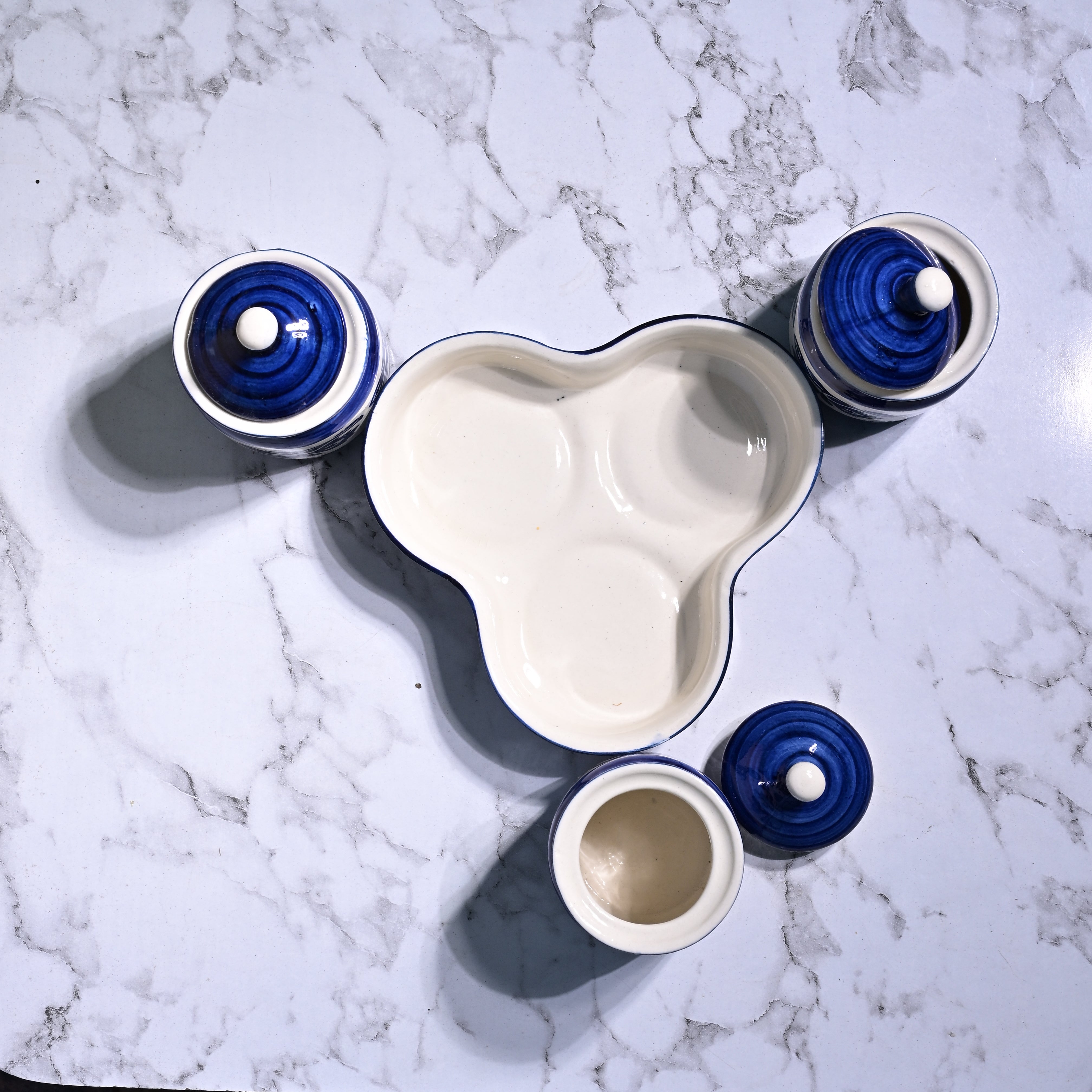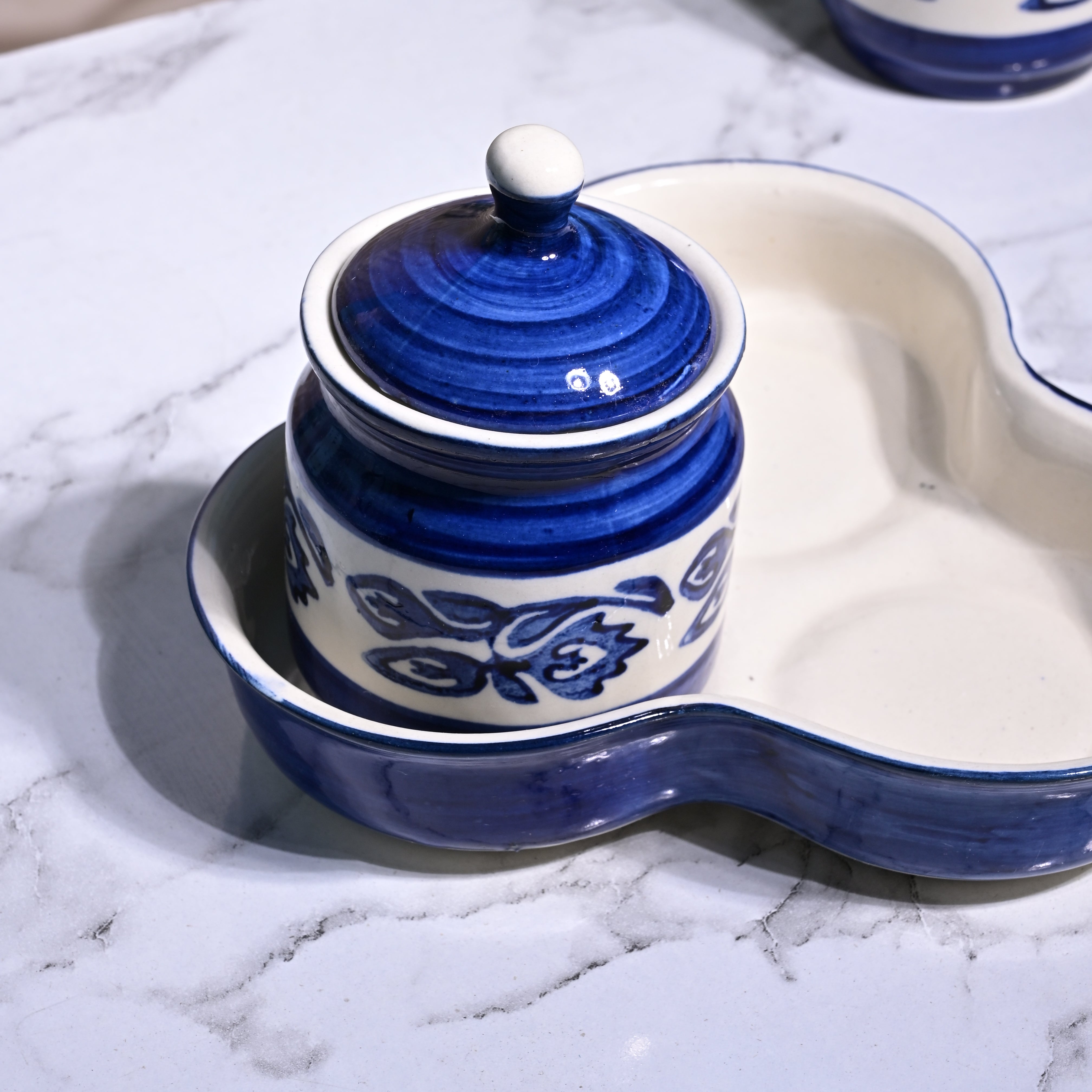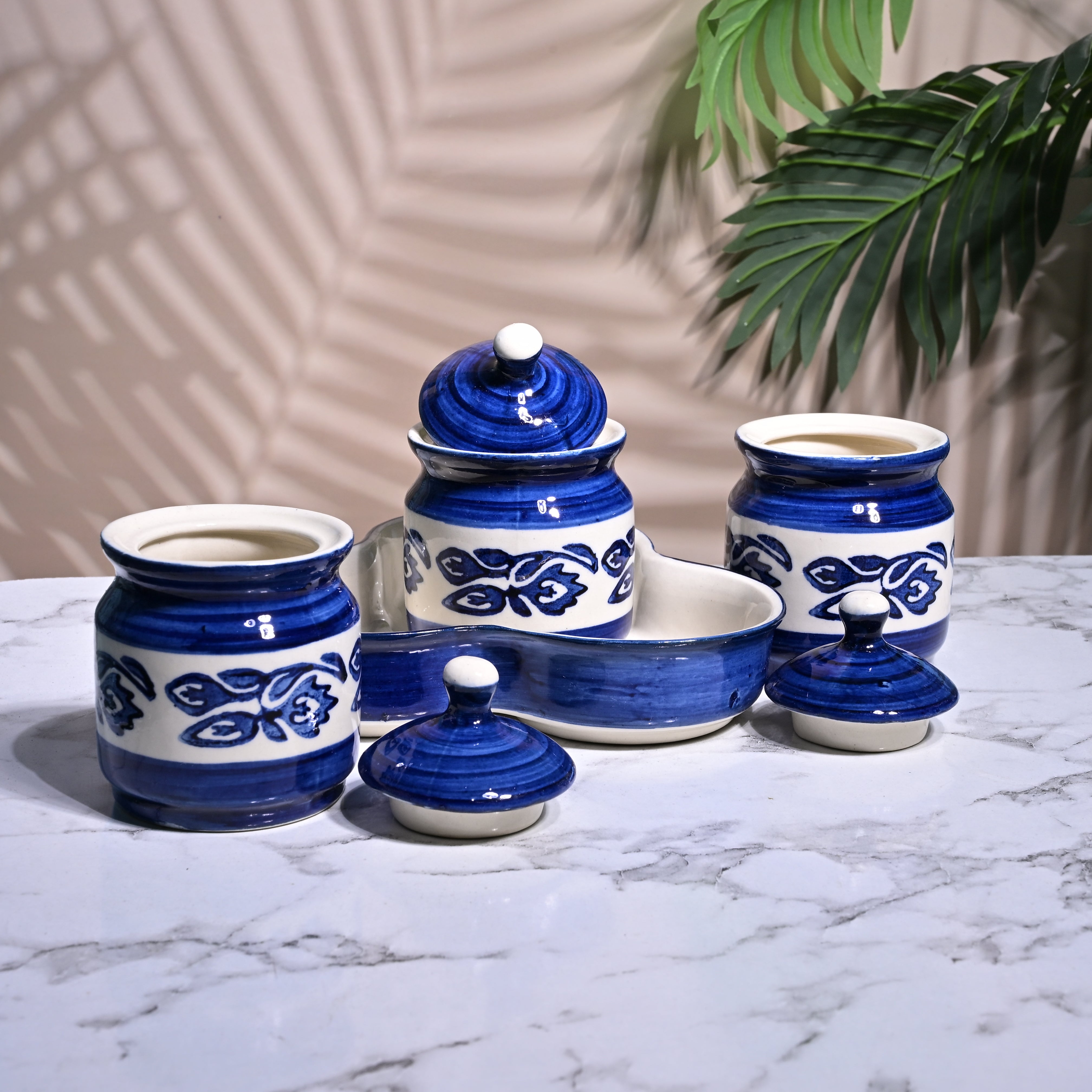 COD availableTransform your kitchen with the Royal Blue Elegance Hand-Painted Condiment Set. This exquisite collection features three intricately hand-painted ceramic jars, each adorned with a vibrant blue floral design that exudes sophistication. The set comes with a matching tray, offering both beauty and practicality for storing and serving your favorite pickles, chutneys, or condiments. The fine craftsmanship and elegant design make these jars not just functional, but also a striking addition to your dining or kitchen decor.