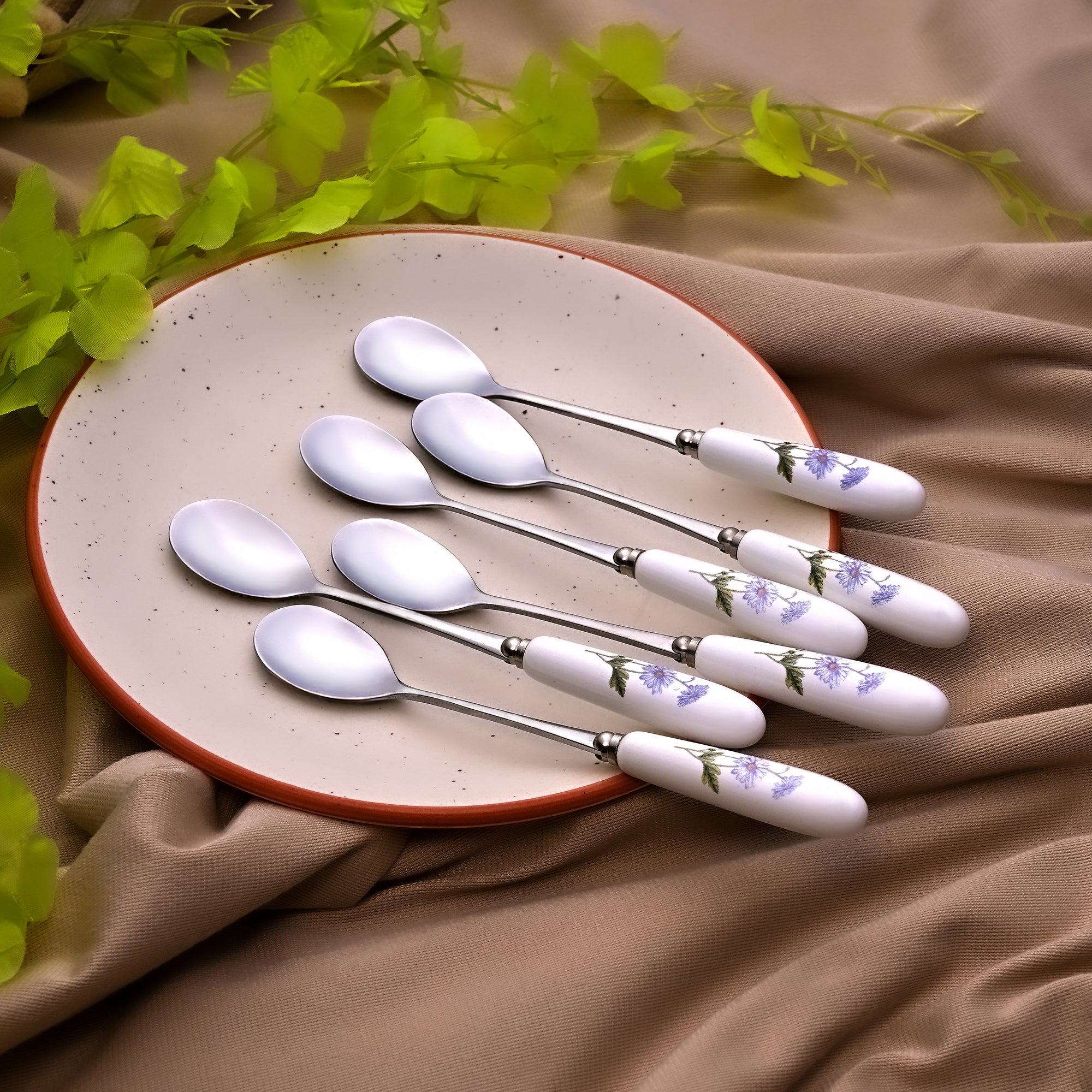 COD availableThis dessert spoon set combines premium stainless steel with a ceramic handle that feels light and airy in hand. The clustered, bell-shaped lavender flowers add a soft and elegant charm, enhancing the beauty of each piece.