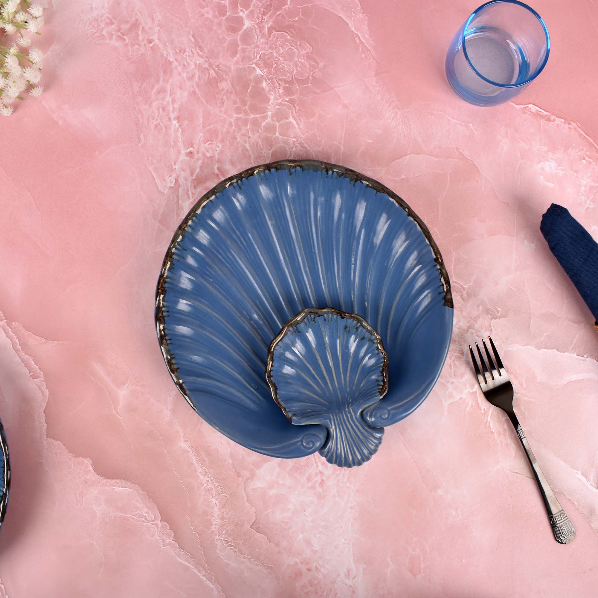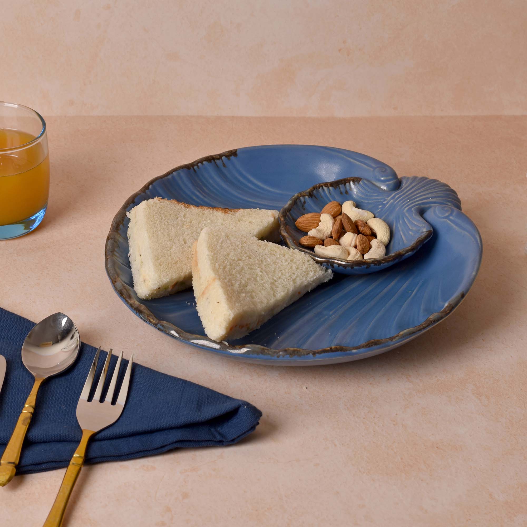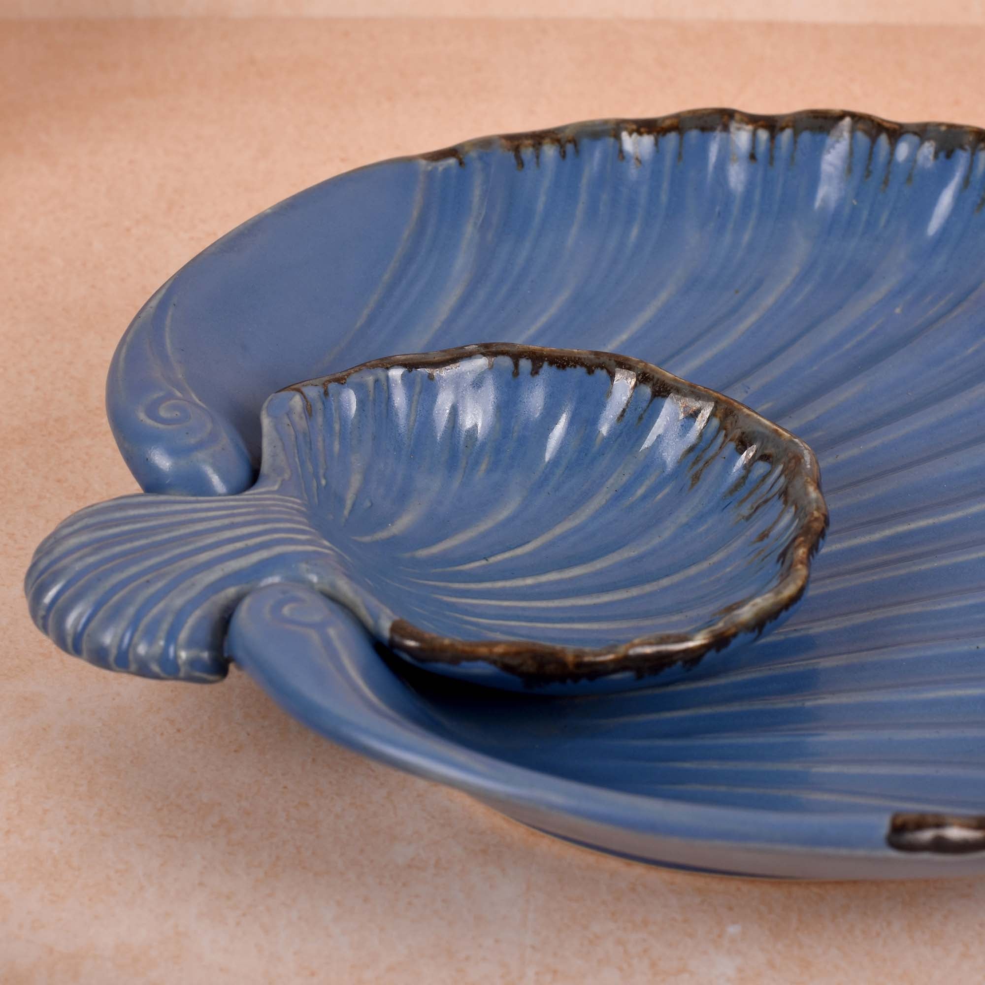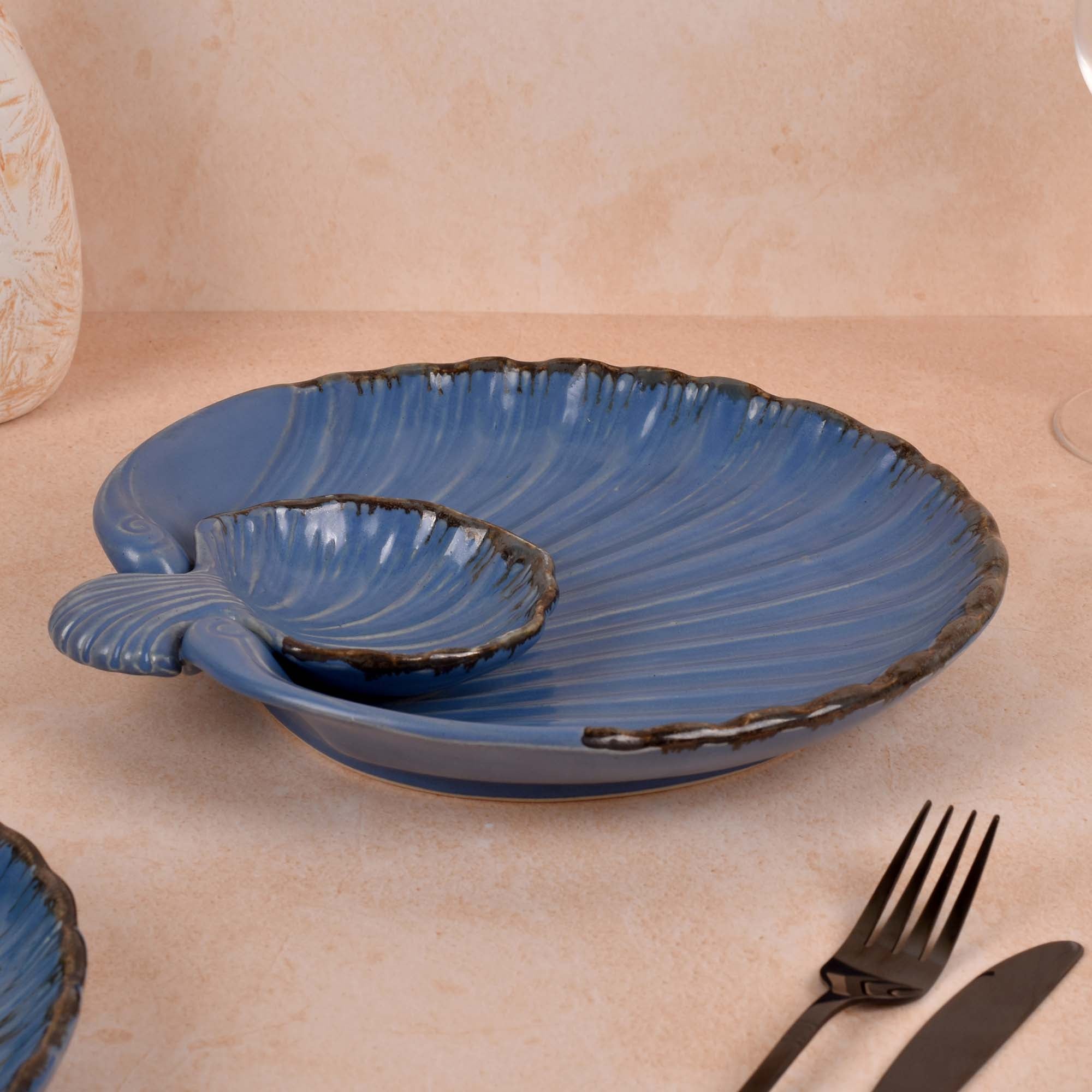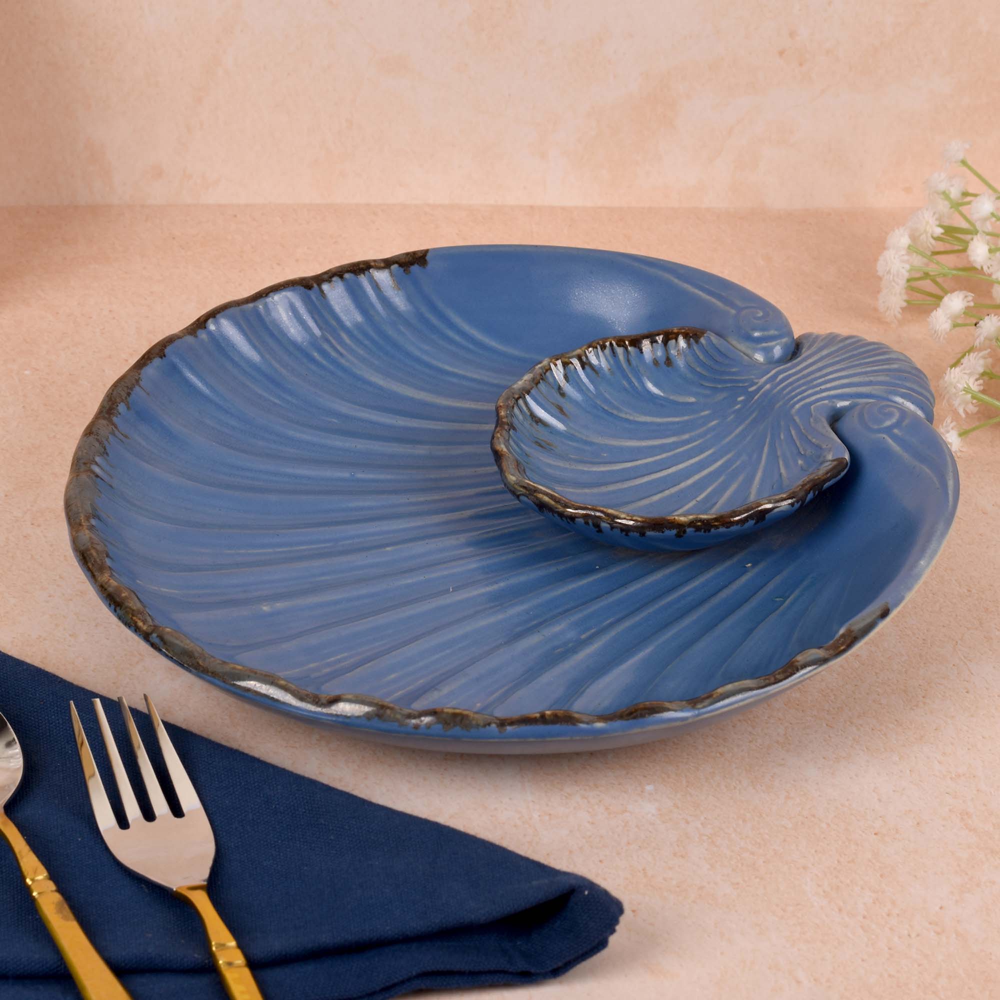 The Subtle Blue Serving Platter takes its shape from the ocean's shells and tropical leaves and gently curves into itself to offer a perfect space for serving snacks, dips, or sweets. The delicate ridges and deep blue glaze catch the light beautifully, while the side bowl built right in provides charm and purpose. You can use this platter for serving chips and chutney, cookies and cream, nuts and dry fruits - all in one gorgeous piece. The rim features a hand-brushed earth tone that gives it a handmade, one-of-a-kind look. Perfect for all occasions, it represents simplicity, soulfulness, and is beautifully served.
