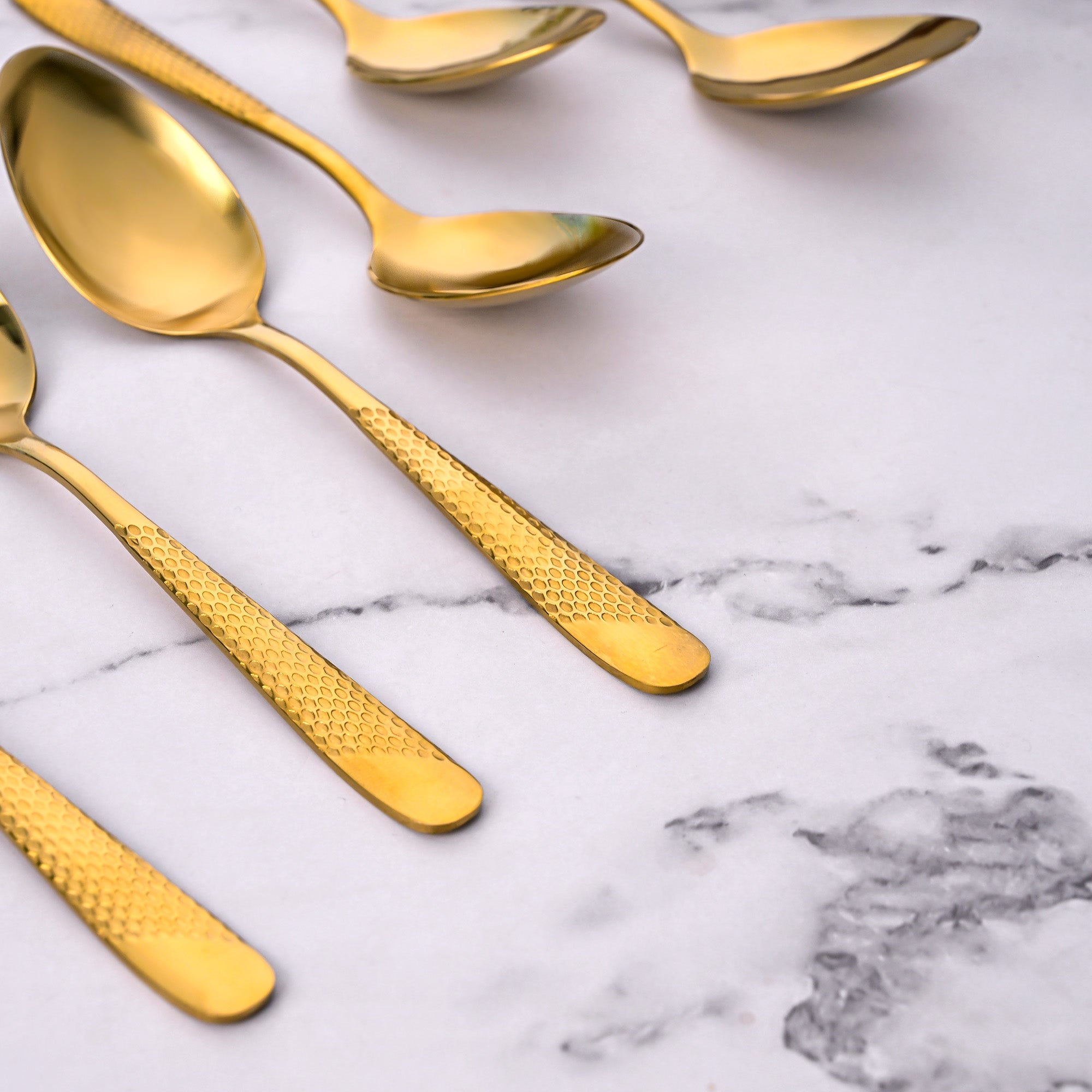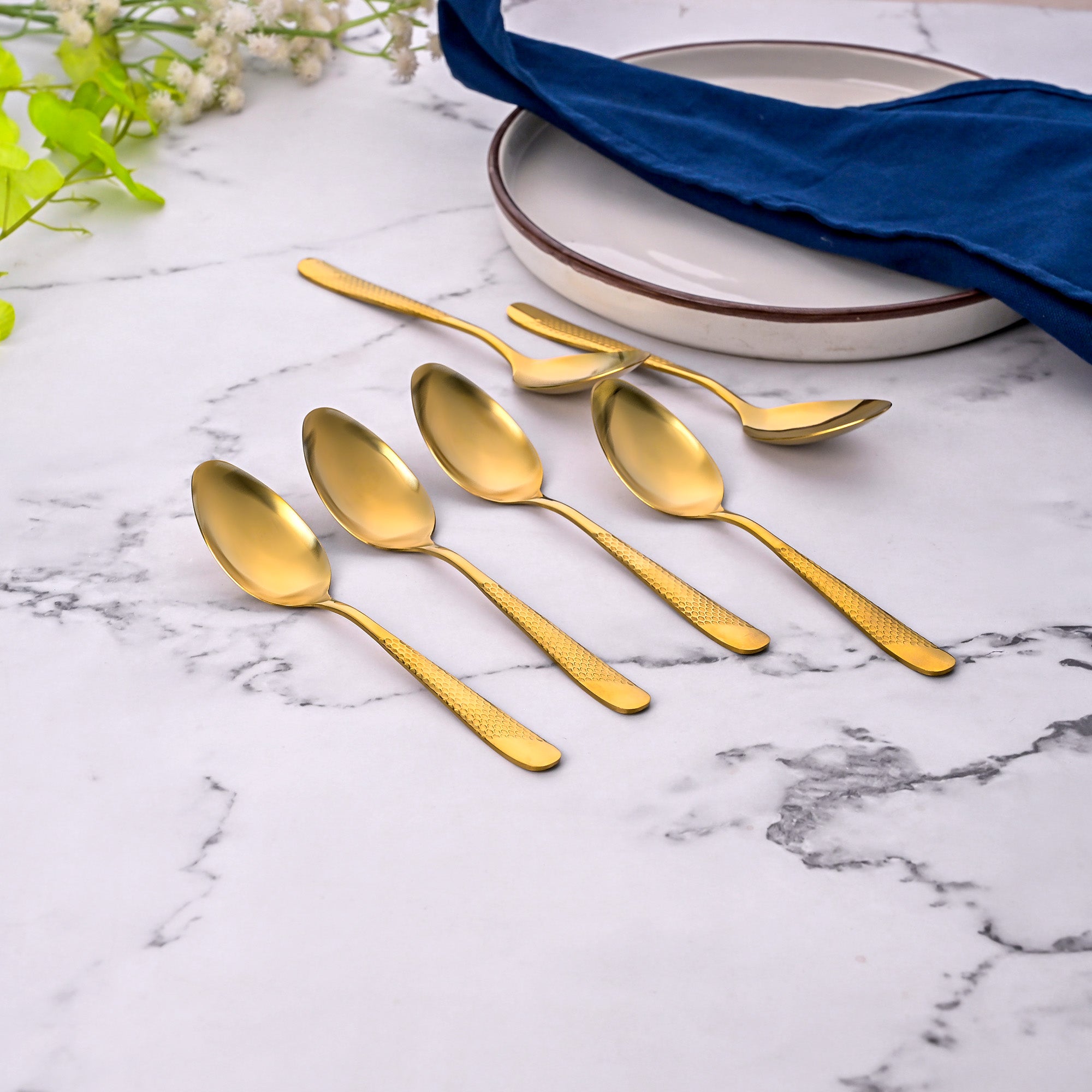 COD availableBring a royal glow to your table with the Sunlit Gold Stainless Steel Tea Spoon.The golden finish shines like soft sunlight, giving your dining moments a rich and elegant feel. Crafted from high-quality stainless steel and wrapped in golden charm. The hammered-texture handle adds a luxe grip while keeping it timeless. Perfect for stirring your chai,coffee enjoying desserts, or scooping your favorite sweet treats. It turns simple moments into golden ones.