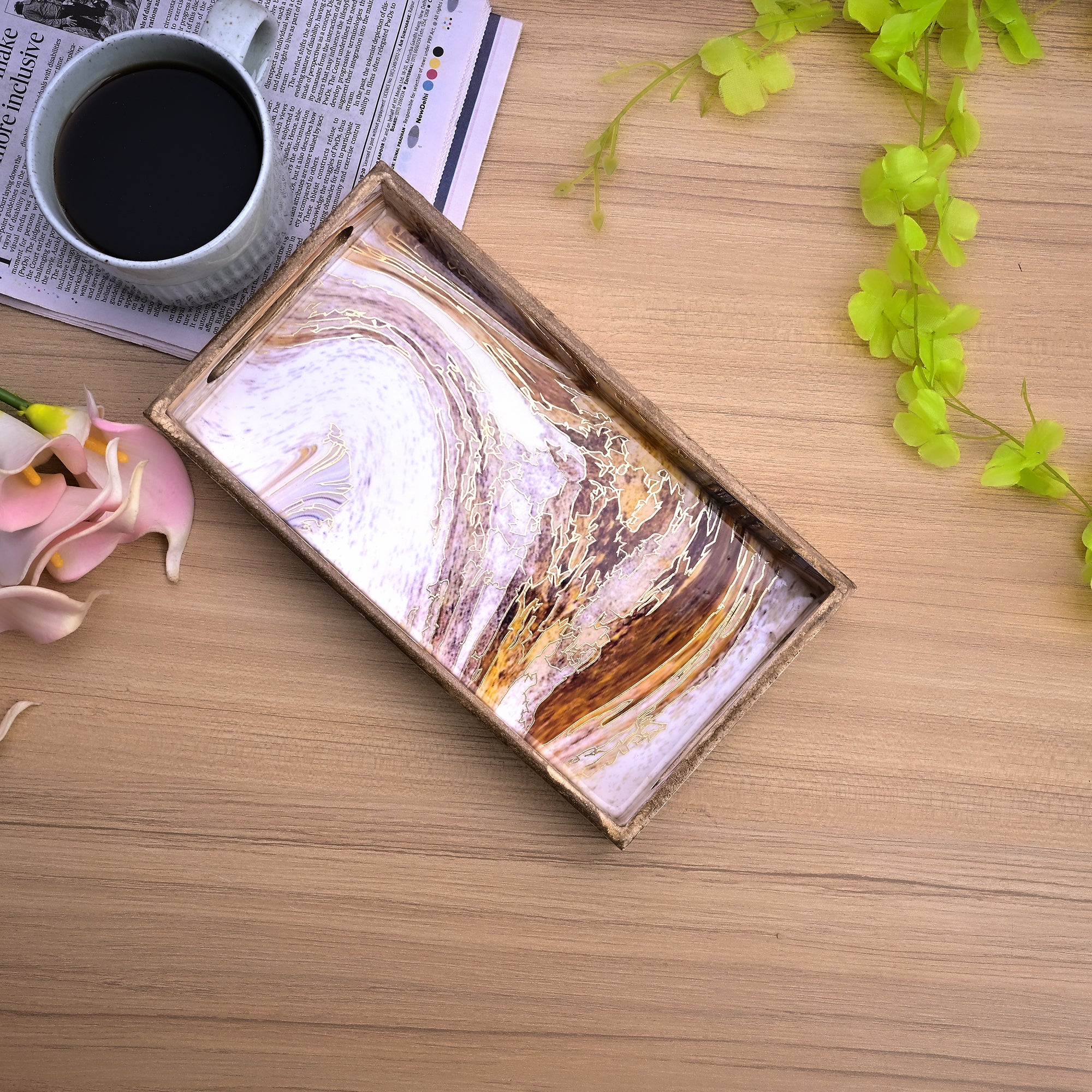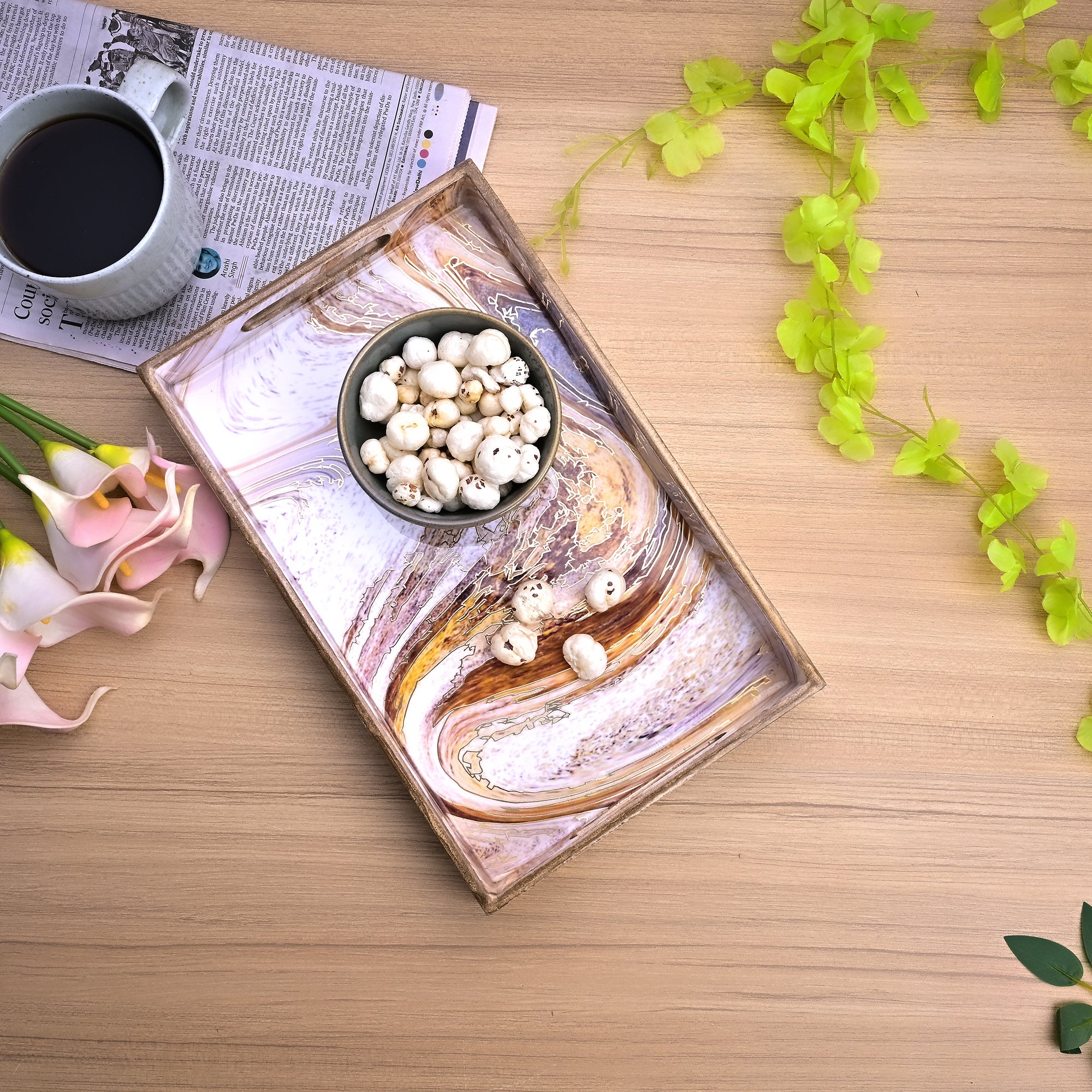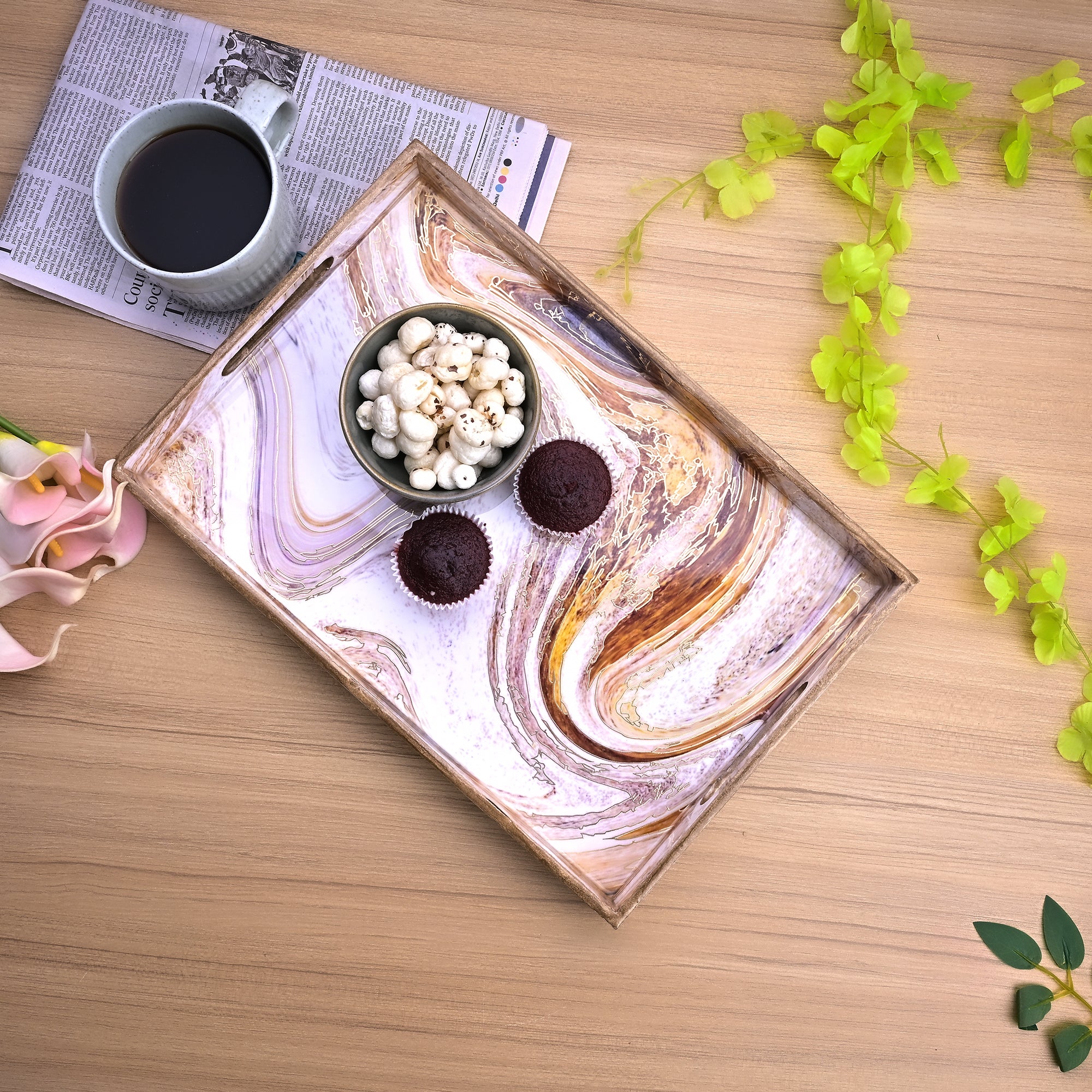 COD availableStill, serving one simple plain tray? Try this gorgeous Swirling Marble Tray. The marble-like design on it’s surface is simply unmissable, your guest won't be able to take their eyes off it. Made from natural rustic wood, brings it both durability and unique earthy elegance to your kitchen. If want to add a touch of nature with a hint of modern style, this tray is just perfect. These wooden trays come in 3 sizes so, you can choose them as per the occasions. For the Morning tea use a small one, snack for friends in the medium or use the large tray for hosting a dinner or something special. Let this artistic-looking wooden tray be the star of your kitchen setup!