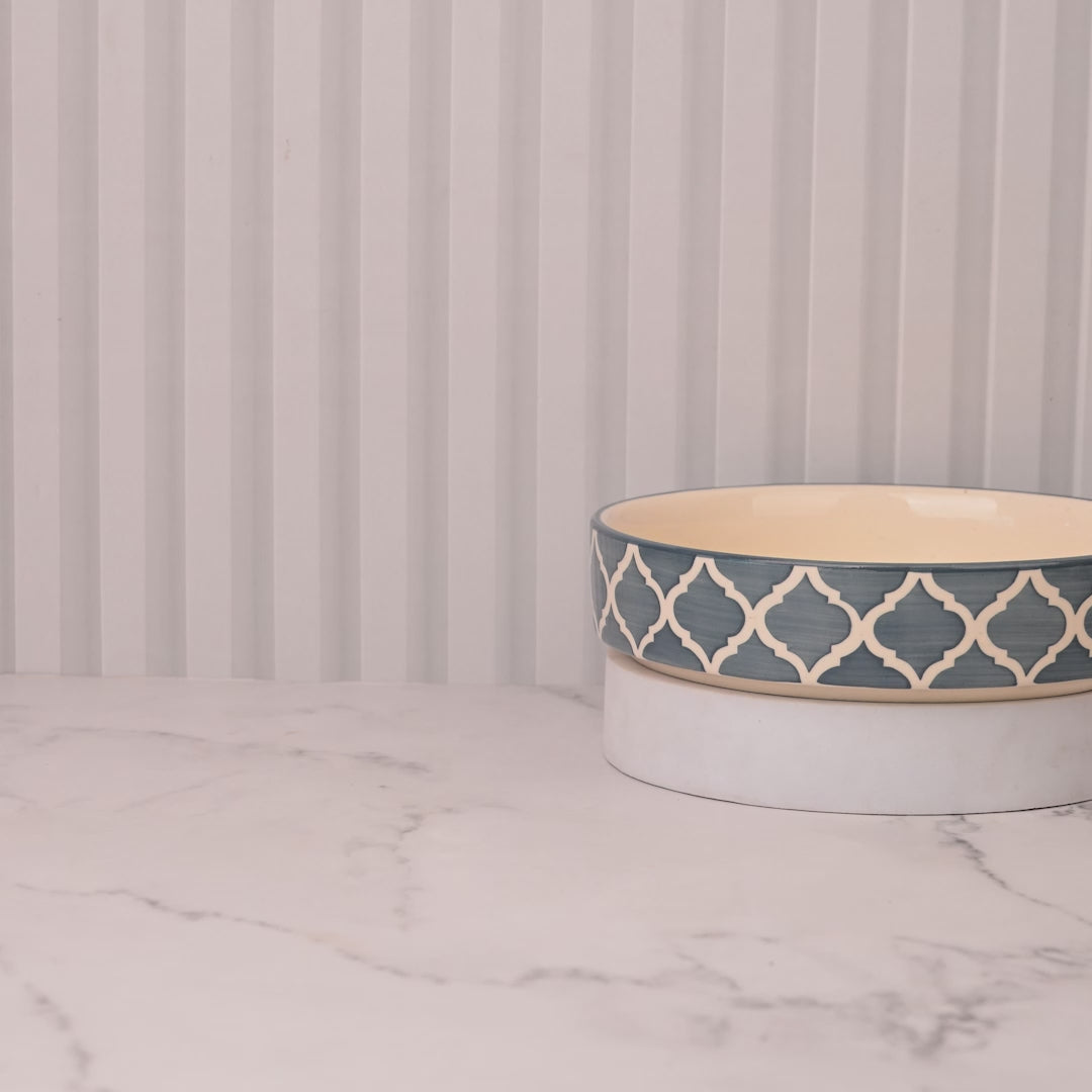 COD availableThis handcrafted Teal Moroccan Pattern Bowl is all about elegance with tradition. Designed in a beautiful teal green and white colour combination, the classic Jaipur pattern brings out that rich artisanal charm. The geometric detailing gives the bowls a bold, timeless look perfect for those who love a touch of heritage on their table. Whether it’s dal-rice, sabzi, snacks, or desserts, these bowls fit right in. The set comes in three practical sizes (Large, Medium, and Small), so you’re always ready to serve in style.