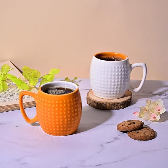 COD availableBrighten up your morning tea time with this vibrant set of Textured Ceramic Tea Cup Set. This set has appealing contrasting orange and white colour. Also, it's bubble-dimpled design is unique and visually appealing. These cups combine contemporary charm with everyday practicality. That's makes them ideal for hot beverages like coffee, tea, or cocoa.