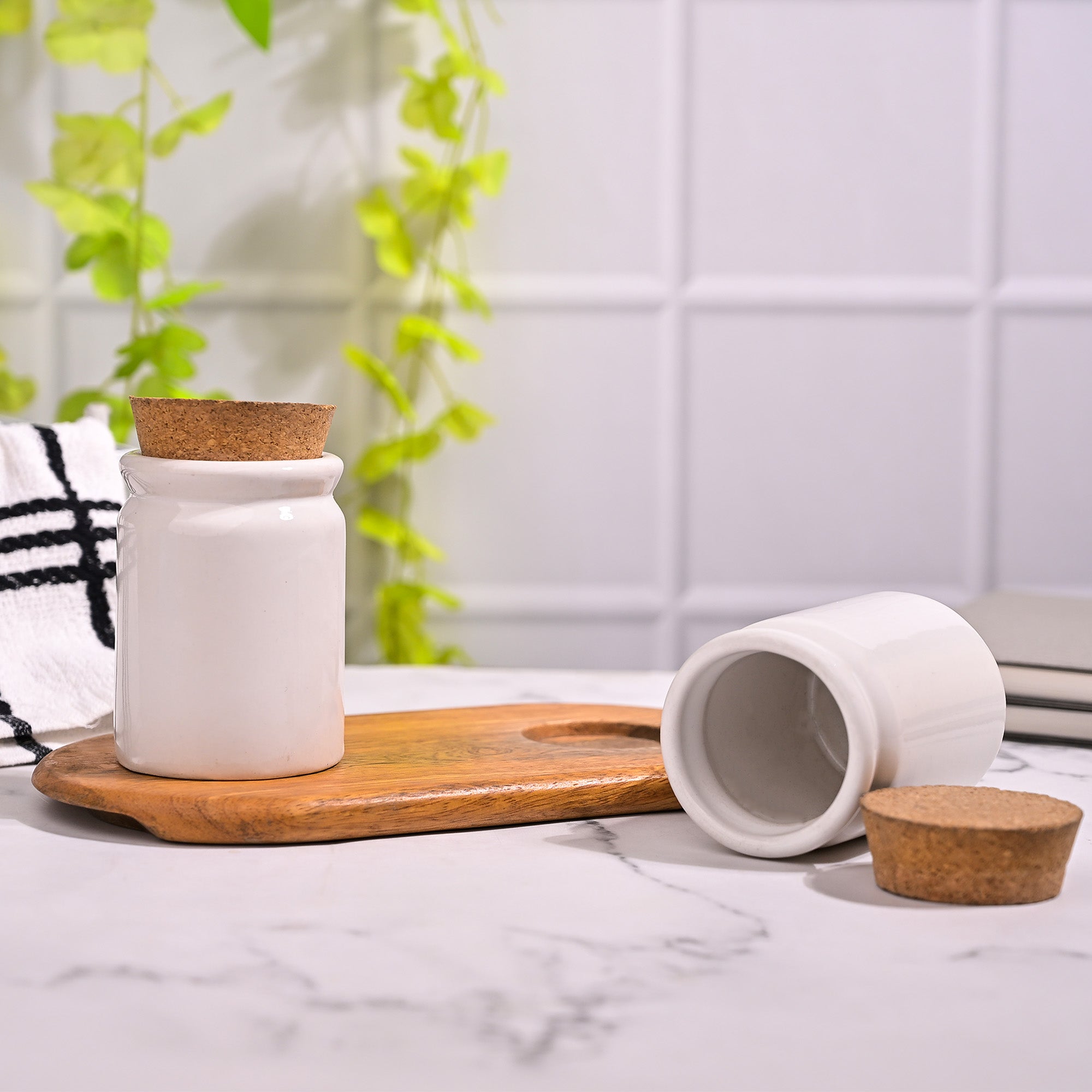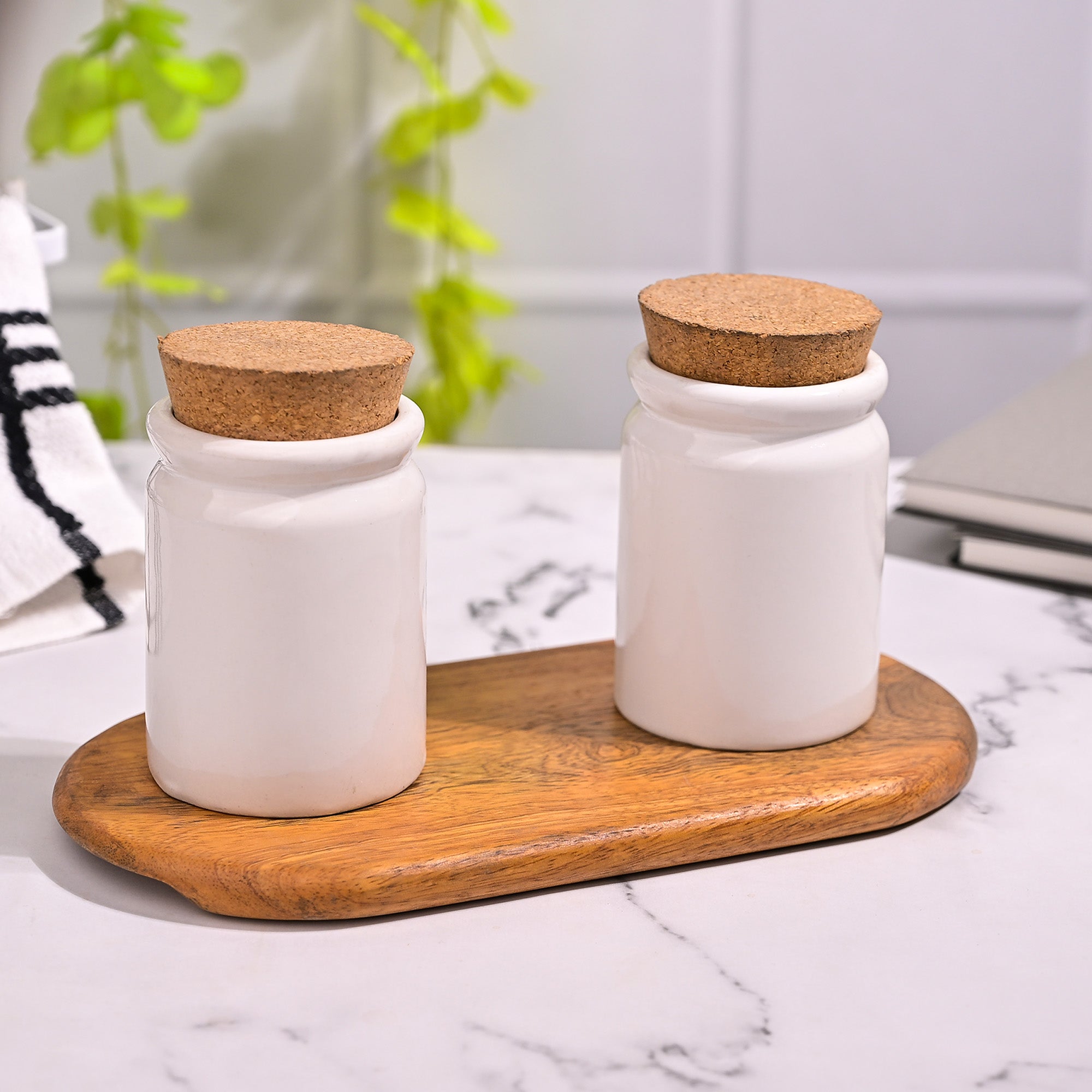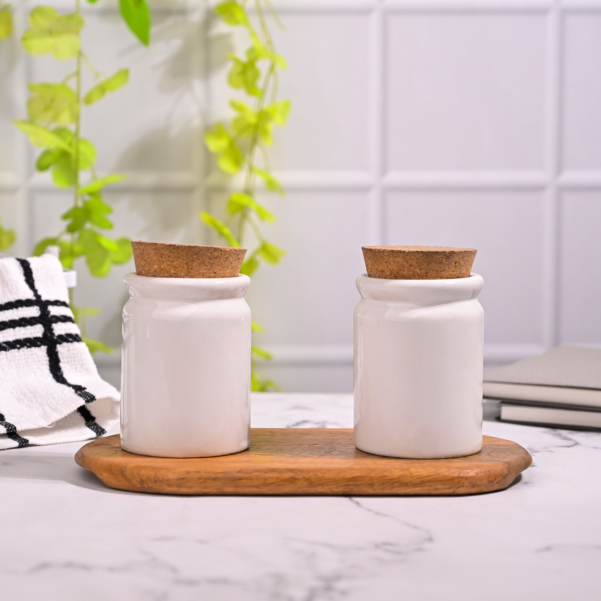 COD availableThis elegant Timeless Ceramic Condiment Jars Set features two pristine white jars elegantly displayed on a sturdy wooden stand, crafted from high-quality wood. The minimalist design of the jars complements the natural texture of the wooden base, making it a perfect addition to any home decor. Ideal for organizing small items or as decorative pieces, this combination of materials offers both functionality and aesthetic appeal.