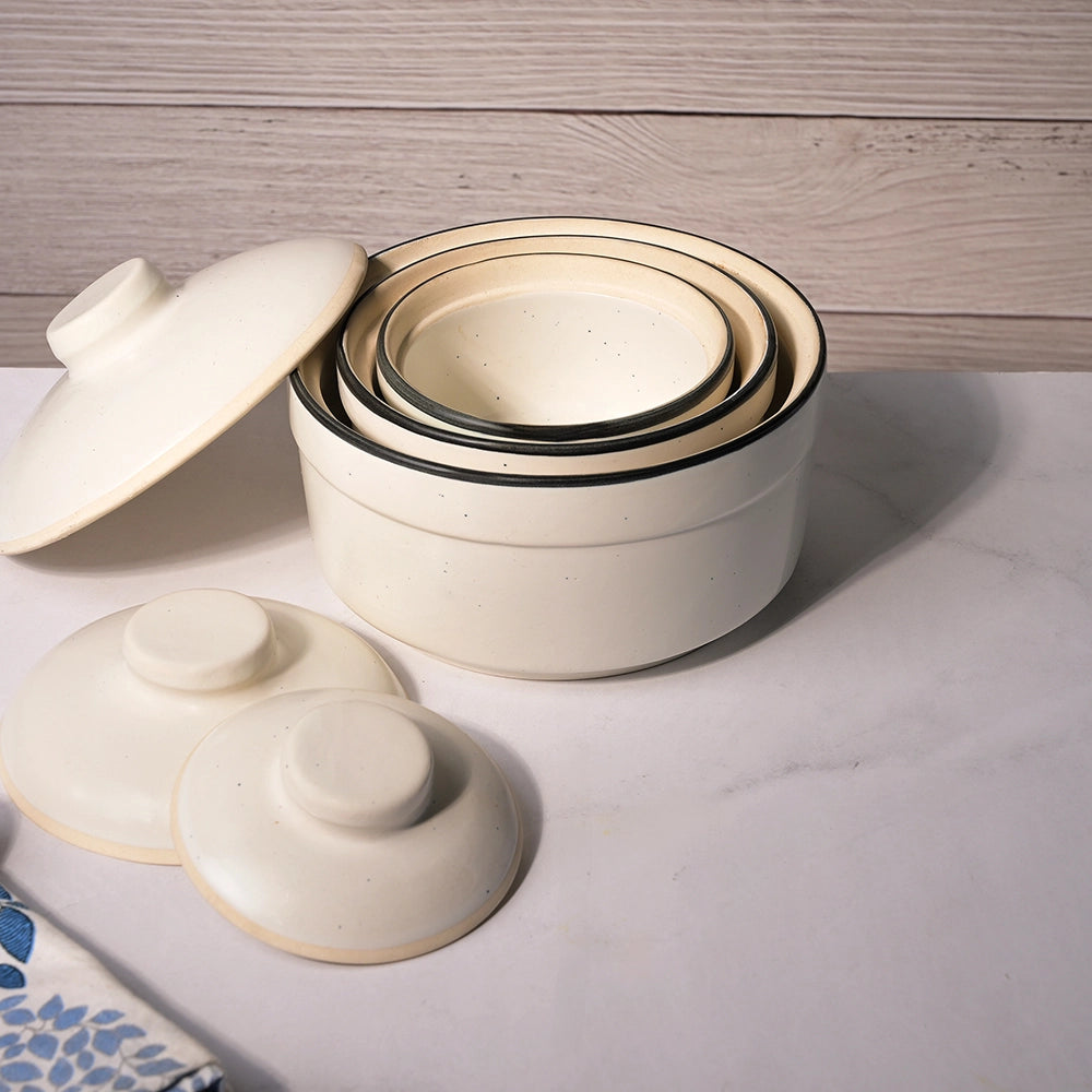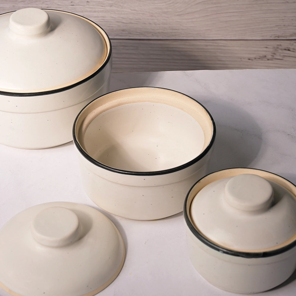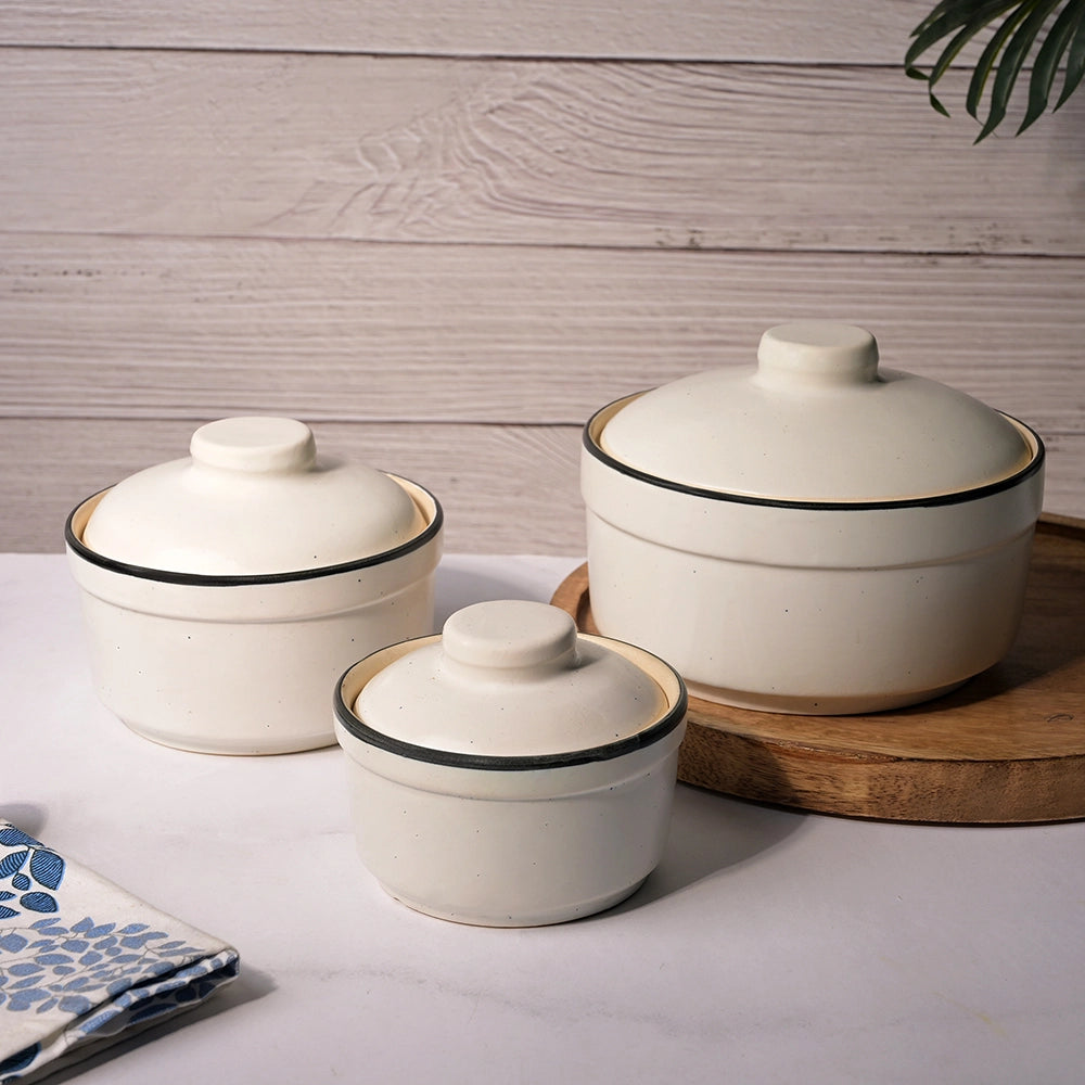 COD availableIntroducing an evergreen design that will always stand out wherever you use it for serving. This White and Black Ceramic Bowl with Lid set is the perfect piece if you want to impress your guests or turn your simple dining setup into something elegant. Made from high-quality ceramic, this serving set is sturdy and reliable, with black detailing on the lids that make it a striking 3-piece set. And it's not just about the colours, the lid’s round handle is designed in a cute, adorable shape that adds extra charm. The size of these serving bowls is just right, making them perfect for simple lunches or dinners. Add this beautiful set to your dining collection and make every meal feel special.