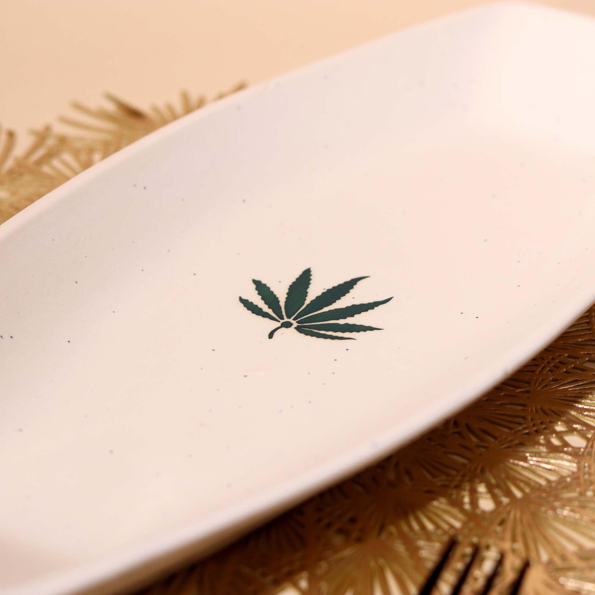 The White Leaf Serving Platter combines a soft minimal appearance with a bright white glaze that allows the small details to shine; like the soft green leaf design in the middle. With a modern elongated shape, it's an ideal platter for serving dry bar snacks, cookies, or fruits in a style that feels both effortless and yet still graceful. This handcrafted platter offers a quiet charm with a soft fluid form and a light feel that appeals to modern and rustic table aesthetics. Whether you're entertaining friends, family, or yourself, the platter activates mindfully serving in the everyday.